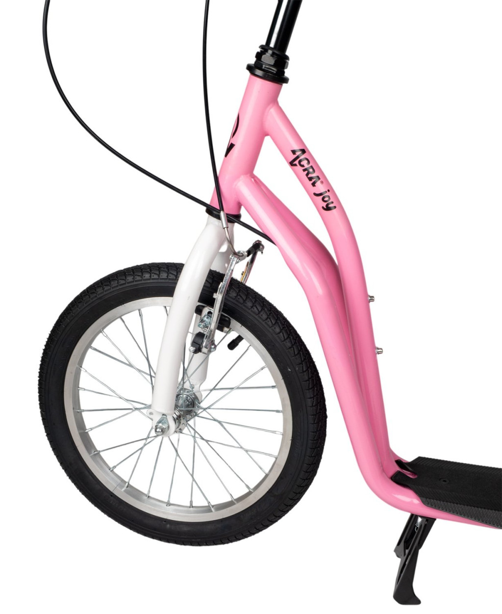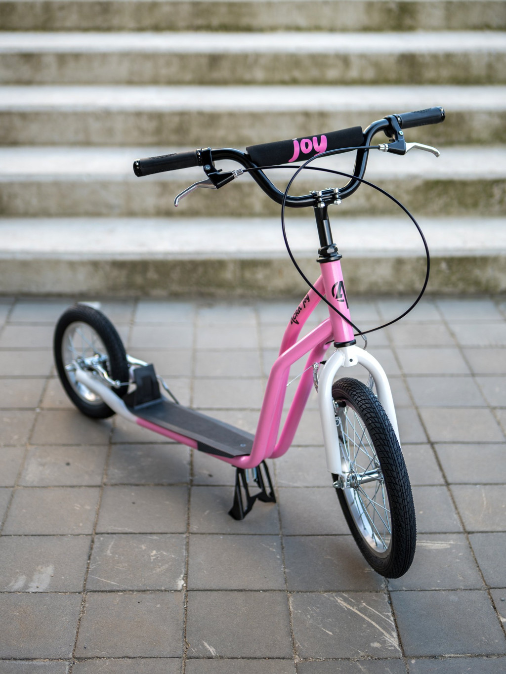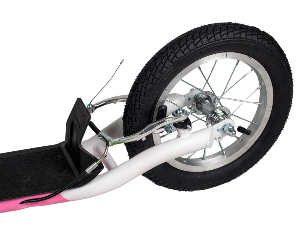 A kerekek felfújhatóak. Az első kerék 16"os, a hátsó kisebb 12"es nagyságú . A robogó kényelmet nyújt az utazás során. A rögzített kormány gumi markolattal rendelkezik a kényelmes és biztonságos tartás érdekében. Minőségi könnyűacél konstrukciójának köszönhetően jól kezelhető.