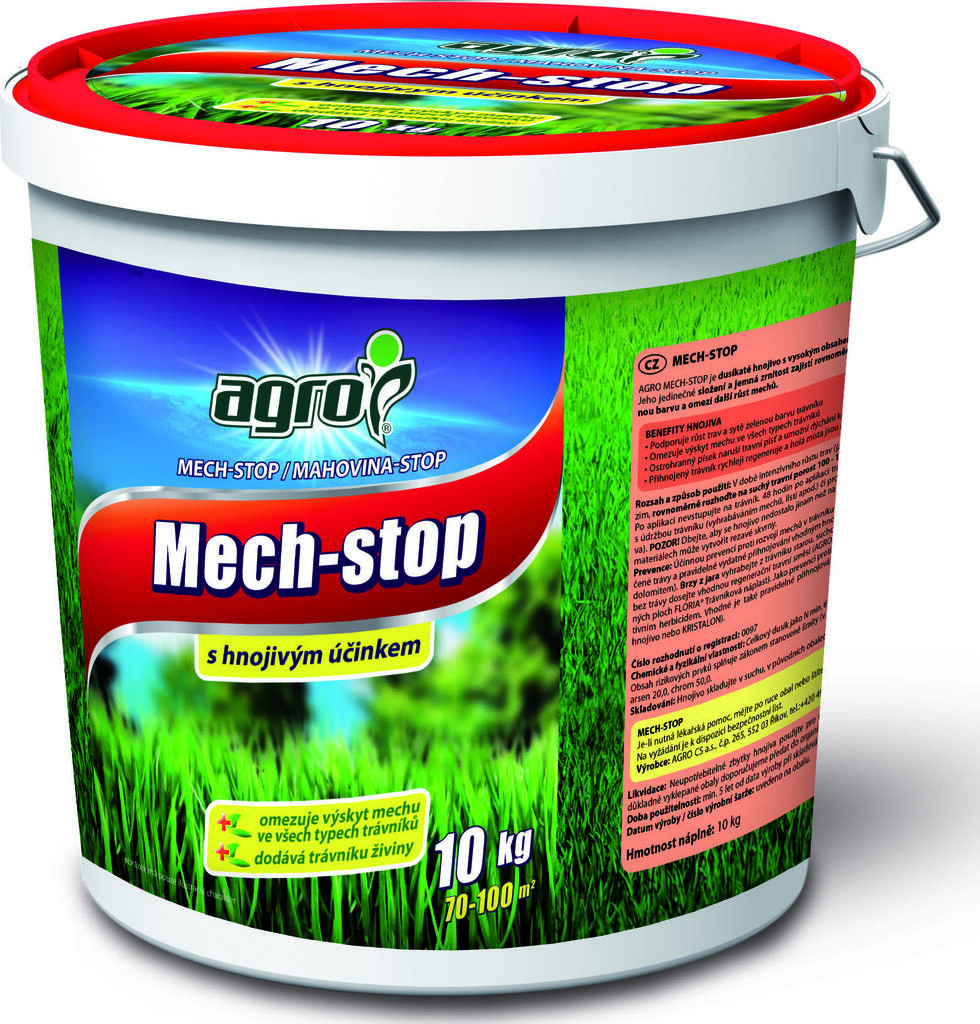 Az Agro Mech-Stop 10 kg műtrágya termék a moha megölésére szolgál, termékenyítő hatással. 6% nitrogénből és 2% vasból áll. Ez fontos a fű színezésére. Főleg kora tavasszal a moha elpusztítására használják.