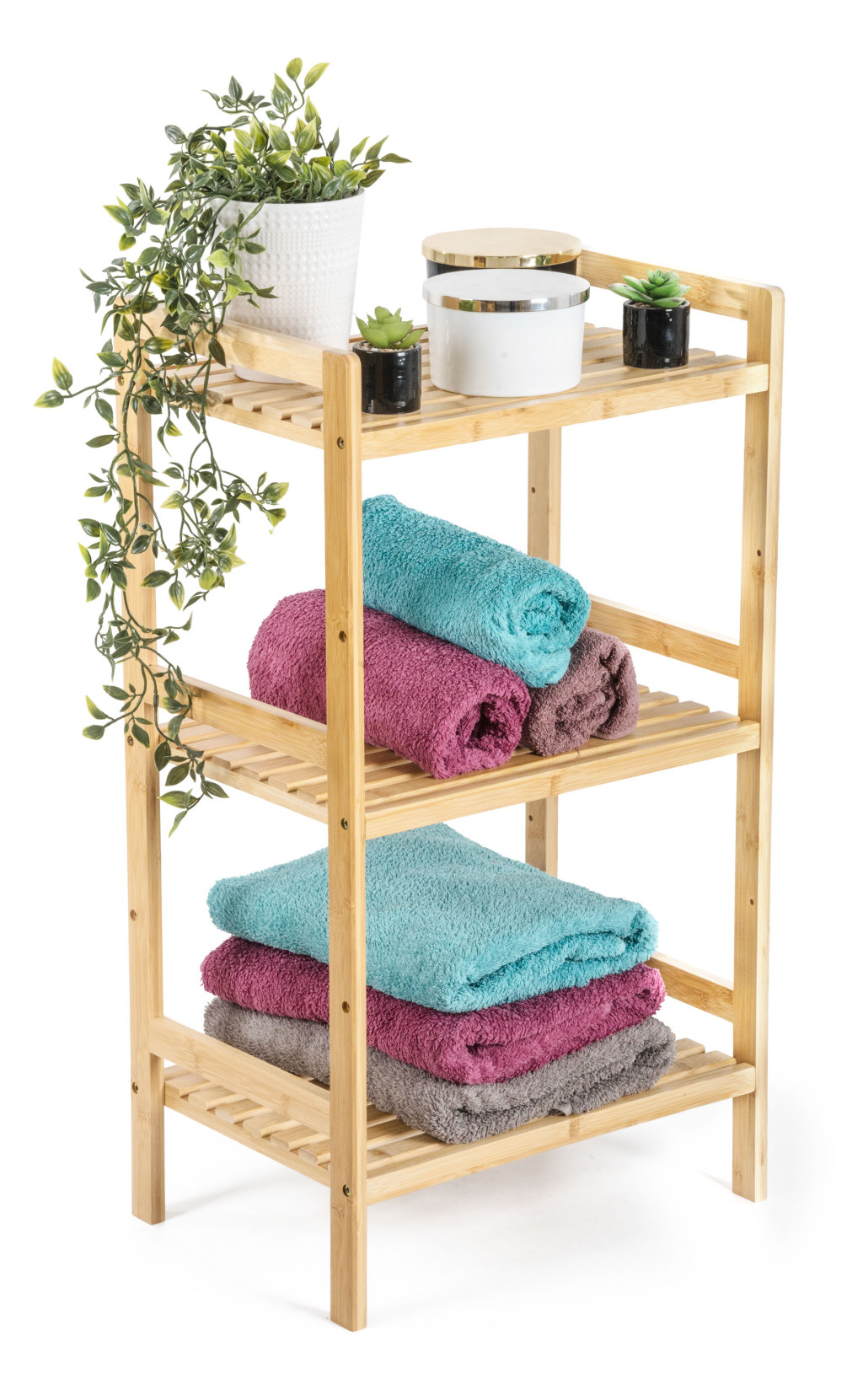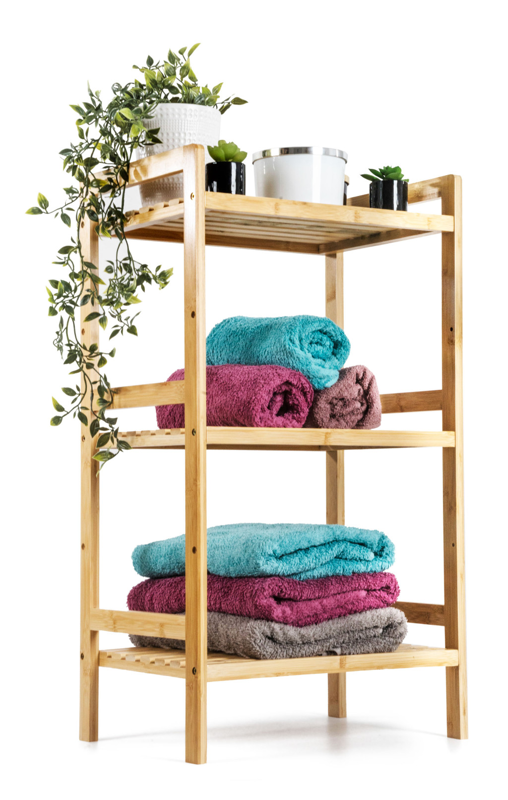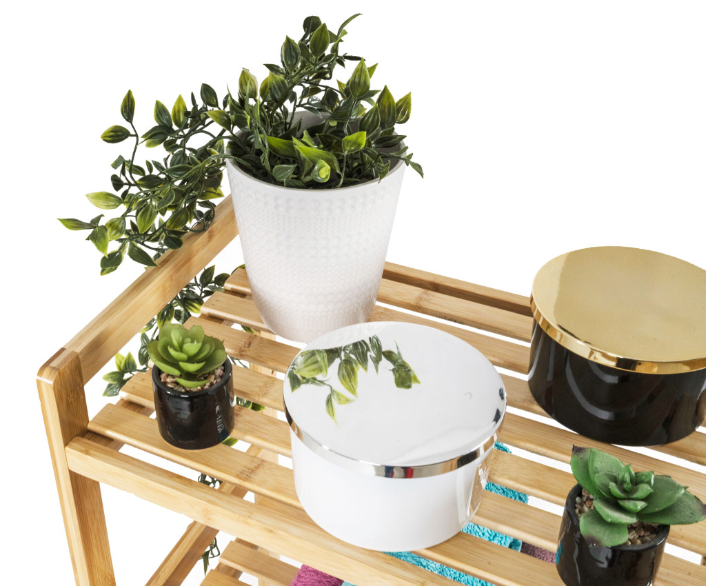 A három polcos bambusz polcállvány kellemes, természetes hangulatot kölcsönöz a belső térnek, könnyedség és természetesség érzetét, ereje és hosszú élettartama pedig stabilitást és tartósságot biztosít.
