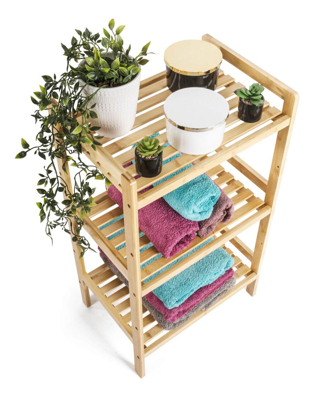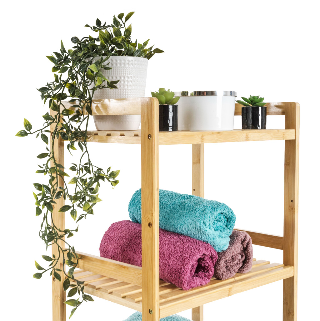 A bambusz meglepően könnyű, így könnyedén kezelheti az egész állványt a polcokkal. Ugyanakkor elég erős ahhoz, hogy elviselje a nagyobb terhelést. Emellett a bambuszfa egyik kiváló tulajdonsága az hogy ellenáll a nedvességnek és a természetes rezisztenciája a baktériumokkal és gombákkal szemben , így nem kell aggódnia az elhelyezés miatt. a fürdőszobában vagy a mosókonyhában.