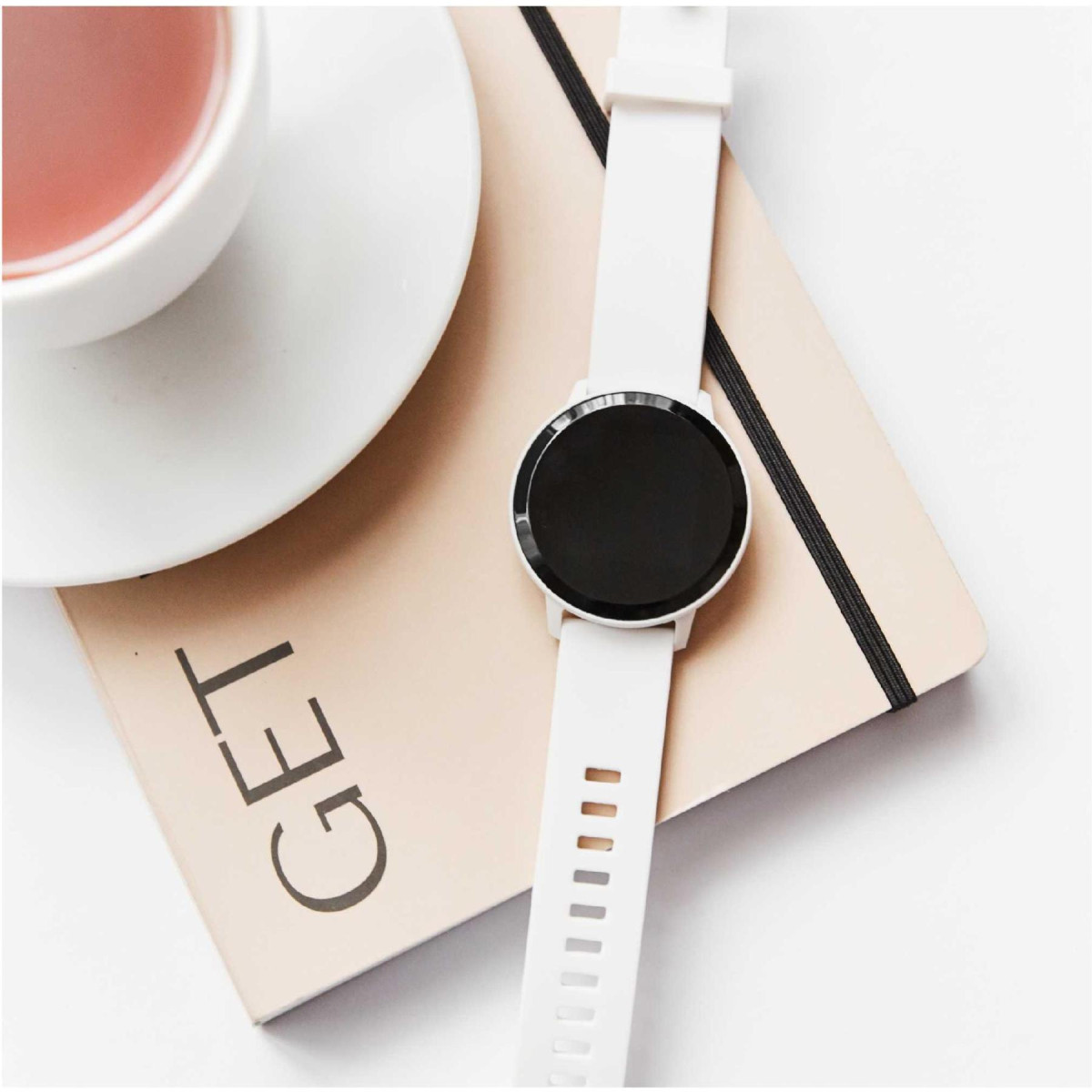 Az óra 1,3”-os IPS kijelzője éles és színgazdag megjelenítést biztosít, amely minden fényviszony mellett jól olvasható. A 240 x 240 pixeles felbontás részletgazdag képet nyújt, míg a fehér szilikon pánt és könnyű műanyag ház kényelmes viseletet garantál egész napra. A mindössze 35 grammos súly szinte észrevétlenül simul a csuklóra.