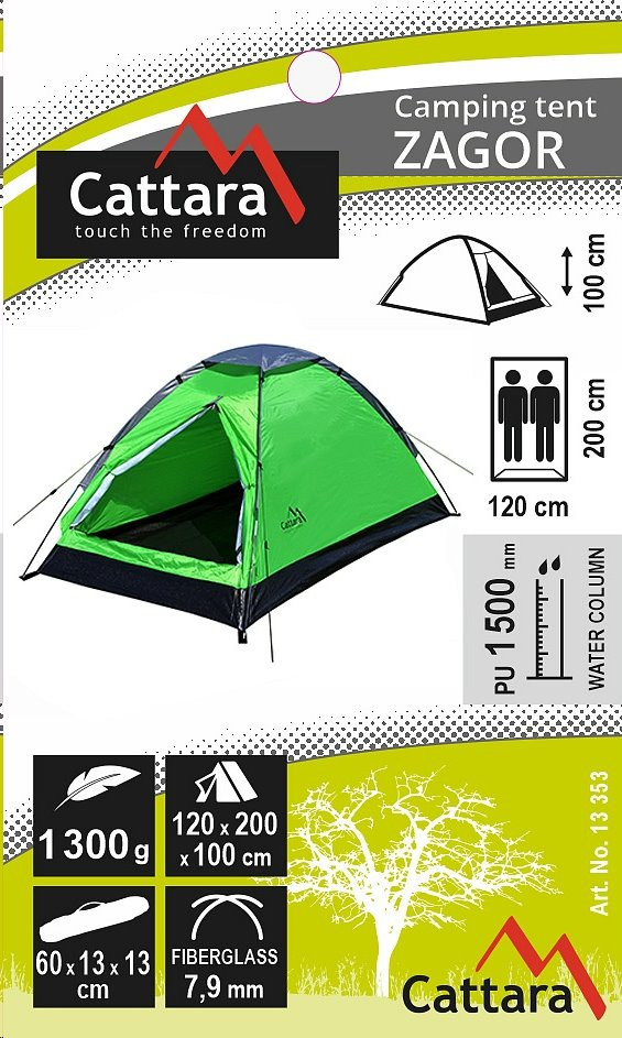 Az egyréteges Cattara ZAGOR sátorban, 200 x 120 x 100 cm teljes méretekkel, elfér 2 személy. A fő bejárat kétoldalas cipzárral van ellátva az egyszerű kinyitásért kívülről és belülről. A fő bejárat kinyitása után légáteresztő hálóra (szúnyoghálóra) talál, amely megakadályozza a hívatlan vendégek bejutását, mint például a szúnyogok, legyek vagy egyéb rovarok.