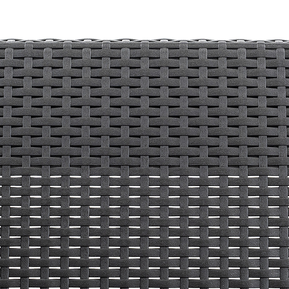 A garnitúra sima karfái, kényelmes háttámlái és a csomagban található puha párnák köszönhetően minden adott a kikapcsolódáshoz. Az elegáns grafit színű rattan hatású anyag nem csupán esztétikus, hanem rendkívül tartós és könnyen tisztítható is.