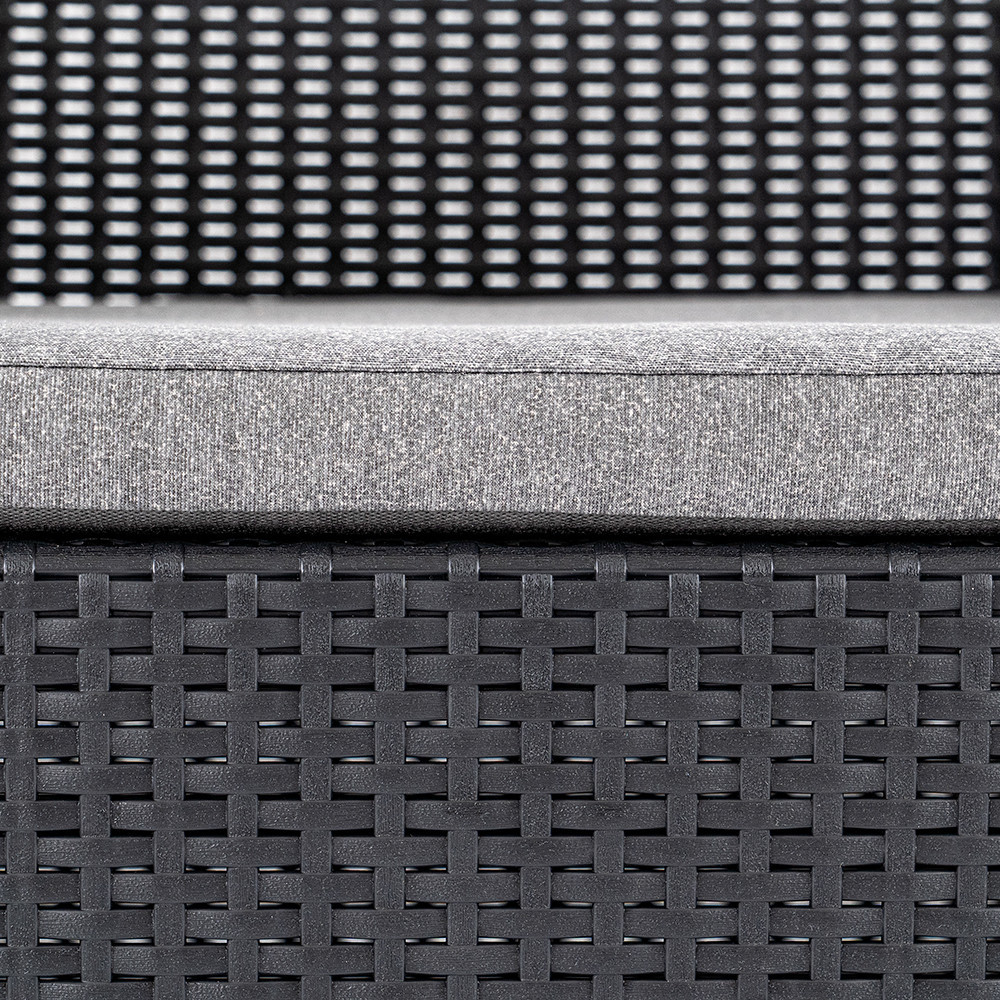 A garnitúrához tartozó párnatartós asztal nemcsak helytakarékos és praktikus, hanem stílusos kiegészítője is az ülőgarnitúrának. Tároló funkciója révén mindig kéznél tarthatod a párnákat vagy egyéb kültéri kiegészítőket.