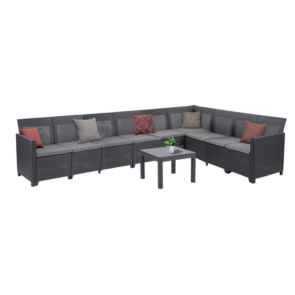 A garnitúra strapabíró, újrahasznosított műanyagból készül, amit úgy formáztak, hogy rattan hatású legyen, így hozva létre a stílus és a tartósság egyensúlyát. A párnák és a váz könnyen illeszthető, bővíthető rendszerben működnek – így biztosítva a teljes szabadságot és hosszú élettartamot.