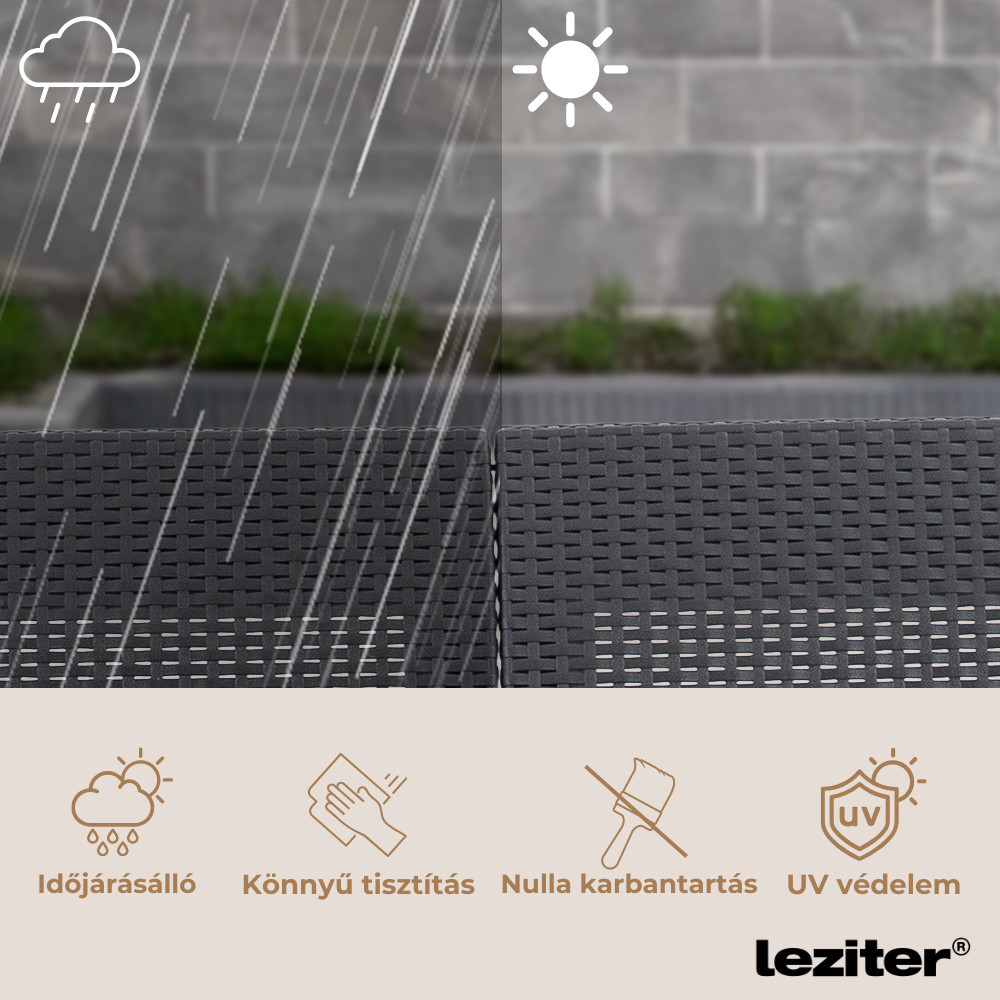 A bútor erős és tartós műanyagból készült. Az erős, tartós kialakítás nagyfokú megbízhatóságot jelent a gyakorlatban és azt, hogy a bútordarabok kivétel nélkül hosszú élettartamot biztosítanak, az örömteli, nyári napokat fűszerező használaton kívül. Ezek az előnyök mellett könnyen mozgatható így bárhova áthelyezheted egyszerűen. Össze szerelése nem igényel szakmai tudást.