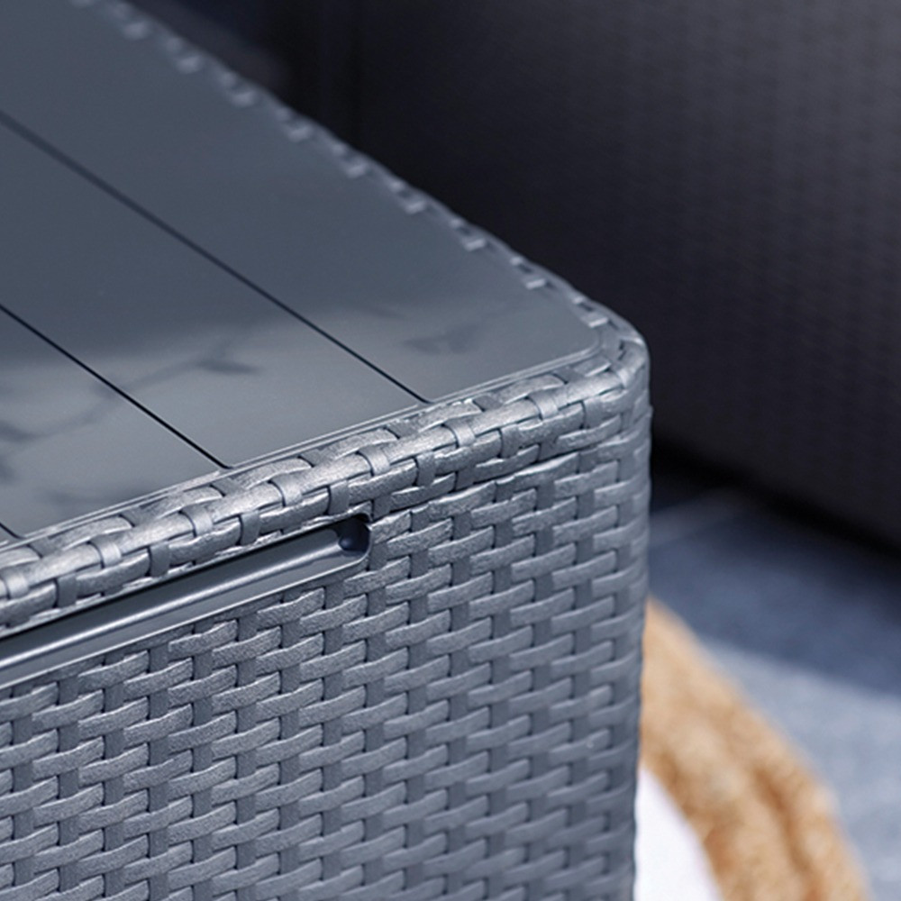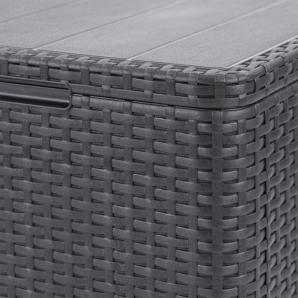 Ez egy rattan stílusra emlékeztető elegáns asztal párnatartóval. Ez a bútor kellemessé teszi a kertben vagy a teraszon töltött nyári napokat. Ez a bútor színt visz a minden napjaidba kellemes megjelenésével. Ezzel a tároló asztallal szárazon és biztonságban tudhatja a párnáit, ha nem használja a kerti garnitúrát. A négyzet alakú kerti asztalt eredeti, rattan fonást imitáló borítás fedi. A nagy tárolóval rendelkező asztal kiválóan alkalmas kertek, teraszok és belterek berendezésére is. Nagyon könnyen összeszerelhető és tisztítható. Ellenáll az időjárás viszontagságainak, illetve az UV sugárzásnak.