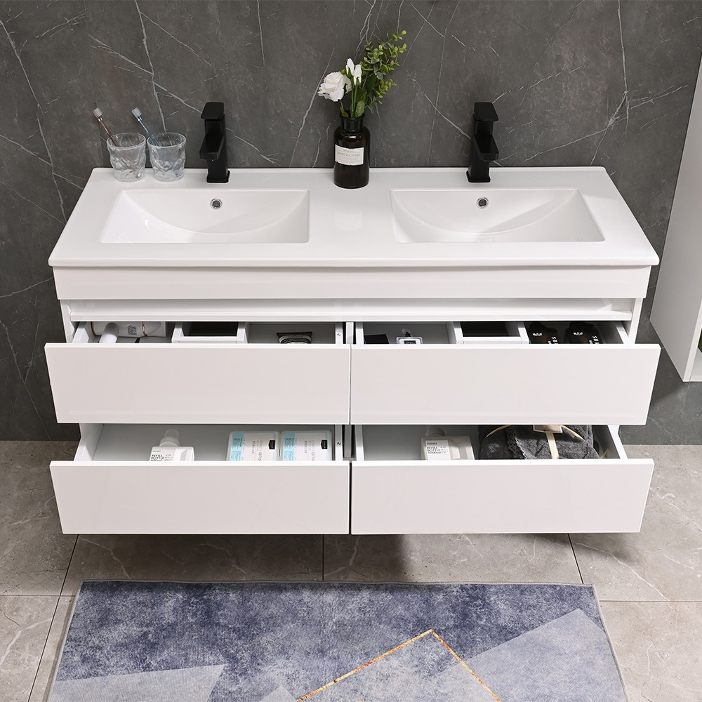 A fürdőszoba bútor rendelkezik négy tágas fiókkal ahol kényelmesen elférnek a fürdőszobai pipere eszközök. Kompakt kivitele miatt kisebb fürdőszobák berendezésére is alkalmas, például panel lakásokban. A termék magasfényű festett fronttal és korpusszal emellett színben passzoló élzárókkal van ellátva. A fürdőszoba bútor felfüggesztett kivitelben kapható.