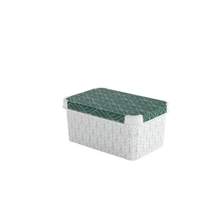 Stílusos Deco Stockholm tárolódoboz a Curver márkától, zöld leveles mintával – praktikus és dekoratív kiegészítője lehet otthonodnak. 6 literes űrtartalmának köszönhetően tökéletesen alkalmas kisebb tárgyak rendszerezésére a fürdőszobában, dolgozószobában vagy akár a gyerekszobában.