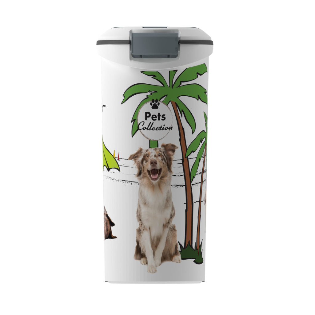 A tartály különleges, ötletes kialakítású fedéllel rendelkezik a könnyű töltés érdekében, amely 2 módon nyitható. Tartalmaz továbbábelső skálát a pontos adagoláshoz, hogy mindig a megfelelő mennyiséget adagolja. Az tároló kerekekkel van ellátva a könnyű szállítás érdekében, így nyugdíjasok és nagyobb gyermekek is könnyen mozgathatják. A kutyás motívum garantáltan örömet okoz minden kutyabarátnak, mivel az elülső oldalon látható egy golden retriever, mögötte a tengerrel, a hajókkal és mellette pálmafákkal, az oldalán még egy barátja helyezkedik el.