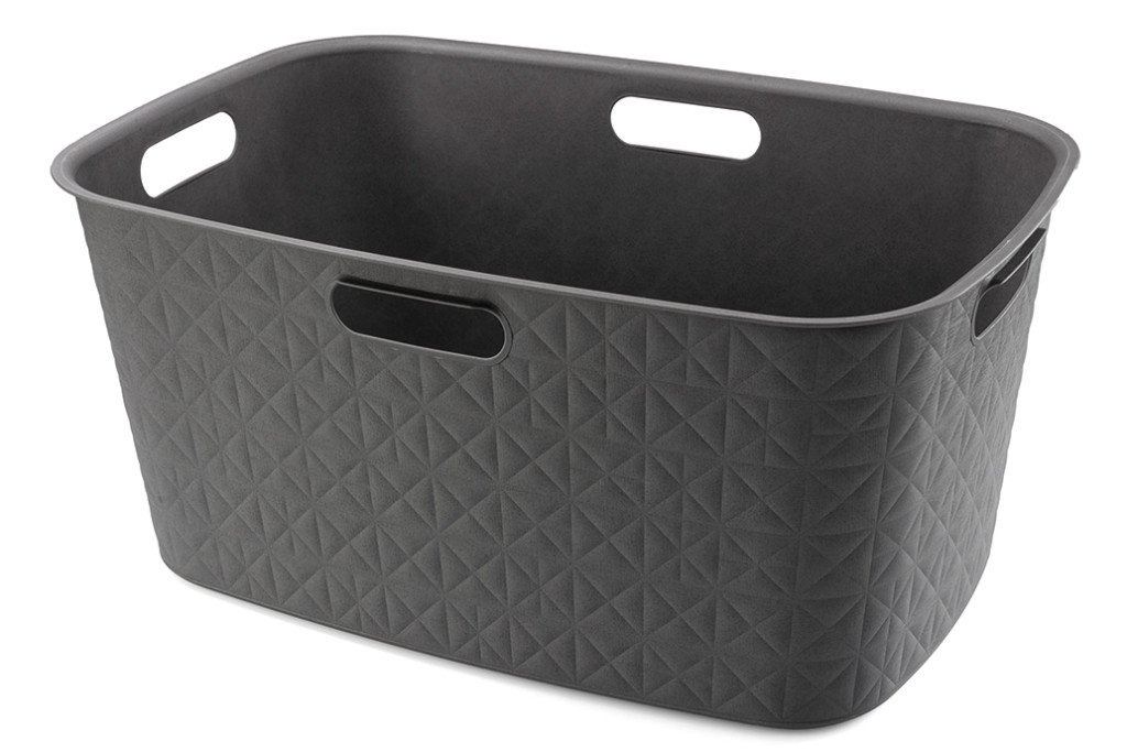 Ez a stílusos és praktikus szennyeskosár 70%-ban újrahasznosított műanyagból készült. Ezért környezetbarátabb. Finom textúrával díszített háromszögek és négyzetek formájában, melya steppelt anyagra emlékeztet. Bármely fürdőszoba felszerelését kiegészíti.