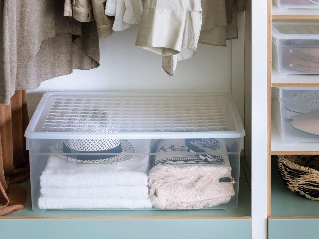 A praktikus, átlátszó Curver tárolódoboz segít rendet tartani a ruhásszekrényben és az otthonban. 45 literes űrtartalmának és lapos kialakításának köszönhetően ideális nagyobb textíliák, ágyneműk és egyéb kiegészítők tárolására.