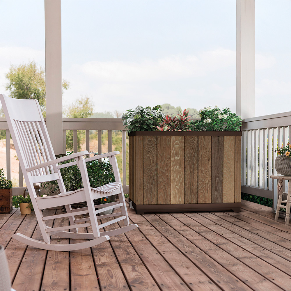 A DecoCoat™ technológiával készült műanyag dió színű láda megtévesztően hasonlít a valódi fára, azonban ezt a virágládát nem kell festeni, lakkozni, olajozni. Nem vetemedik, nem repedezik meg, ellenáll az UV-sugárzásnak és az esőnek is. Ez a virágláda nemcsak egy praktikus eszköz a növényekhez, hanem egy elegáns kiegészítője is lehet a terasznak, erkélynek, bejárat melletti résznek vagy akár beltérnek is.