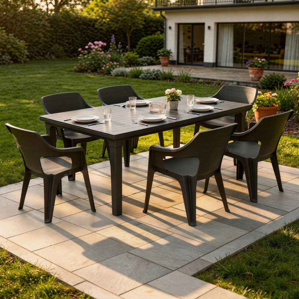 Az Elina 6+1 kerti bútor garnitúra szett grafit színben tökéletes választás családi étkezésekhez, vendégfogadáshoz és minden olyan alkalomhoz, amikor fontos a kényelem és a praktikum.