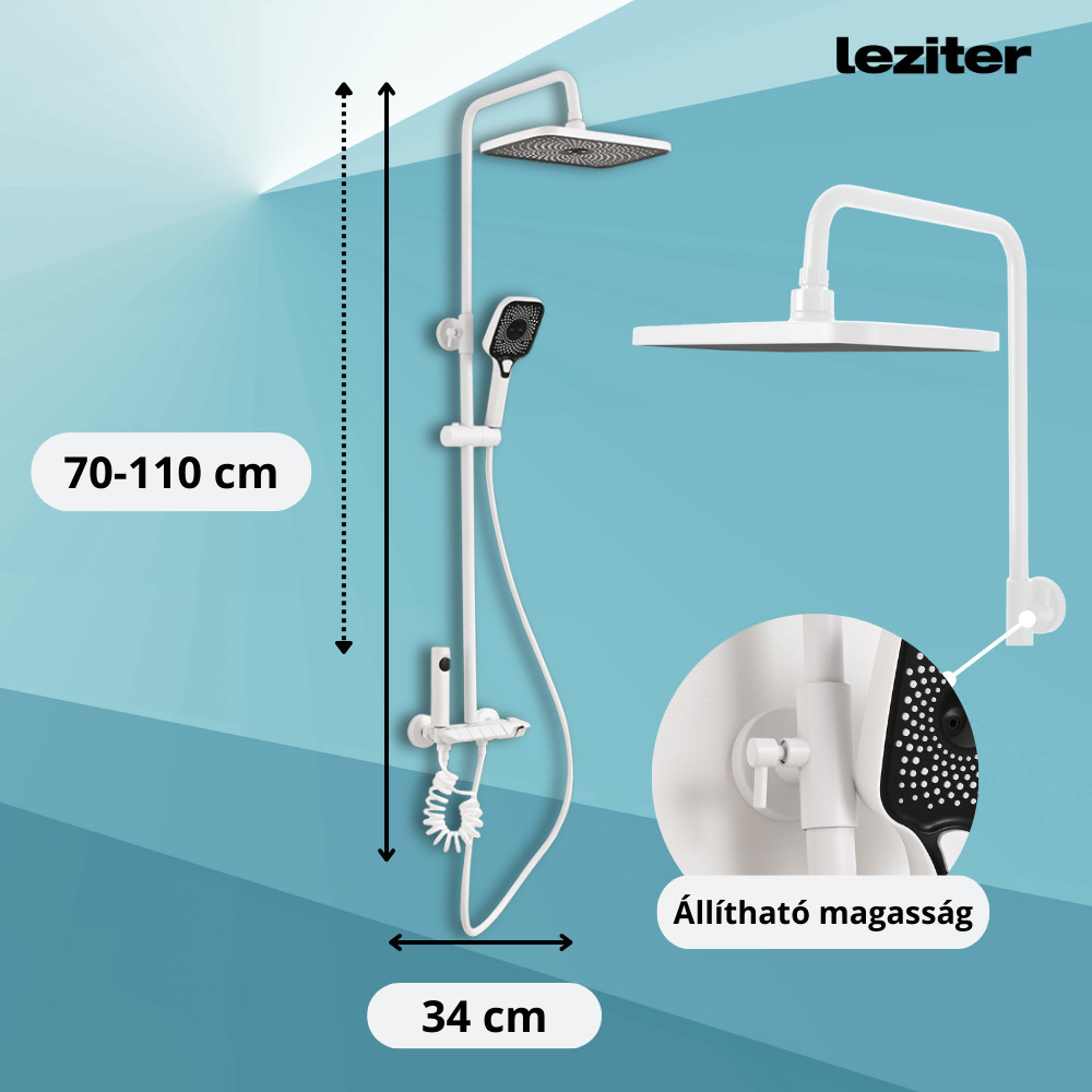 Az Eliz multifunkciós zuhanyszett a Leziter prémium kategóriájú modellje, amely a design, a funkcionalitás és a kényelem tökéletes egyensúlyát kínálja. A modern fehér árnyalat és a letisztult formák elegáns megjelenést kölcsönöznek bármilyen fürdőszobának, miközben a sokoldalú funkciók gondoskodnak a személyre szabott zuhanyélményről.