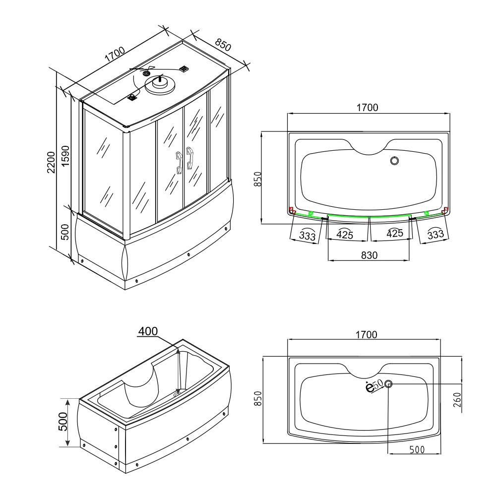 Emilia 85x170 cm hidromasszázs kádkabin elektronikával - Black