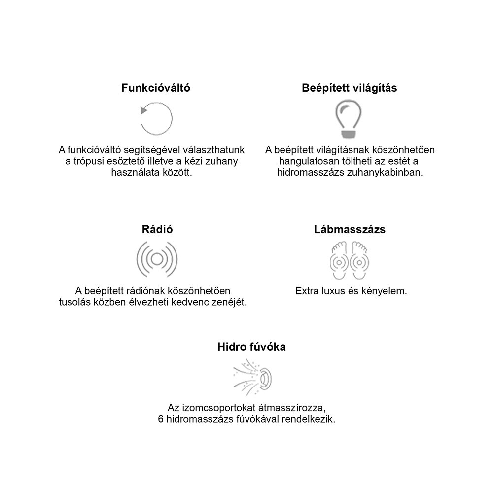 A kabint 5 mm vastag edzett biztonsági üveg veszi körül, amely sötétszürke fix üveg- és ajtópanelekkel, illetve fekete üvegfalakkal fokozza az esztétikai megjelenést. A matt króm vezetősínek és profilok tovább emelik a termék eleganciáját, míg a matt króm funkciópanel a vezérlési lehetőségek középpontjában áll. A kabin 6 hidromasszázs fúvókával rendelkezik, amely garantálja az egész testet átölelő masszázsélményt, miközben a beépített rádió, ventilátor, LED háttérvilágítás és felső világítás tovább fokozza a relaxáció élményét.