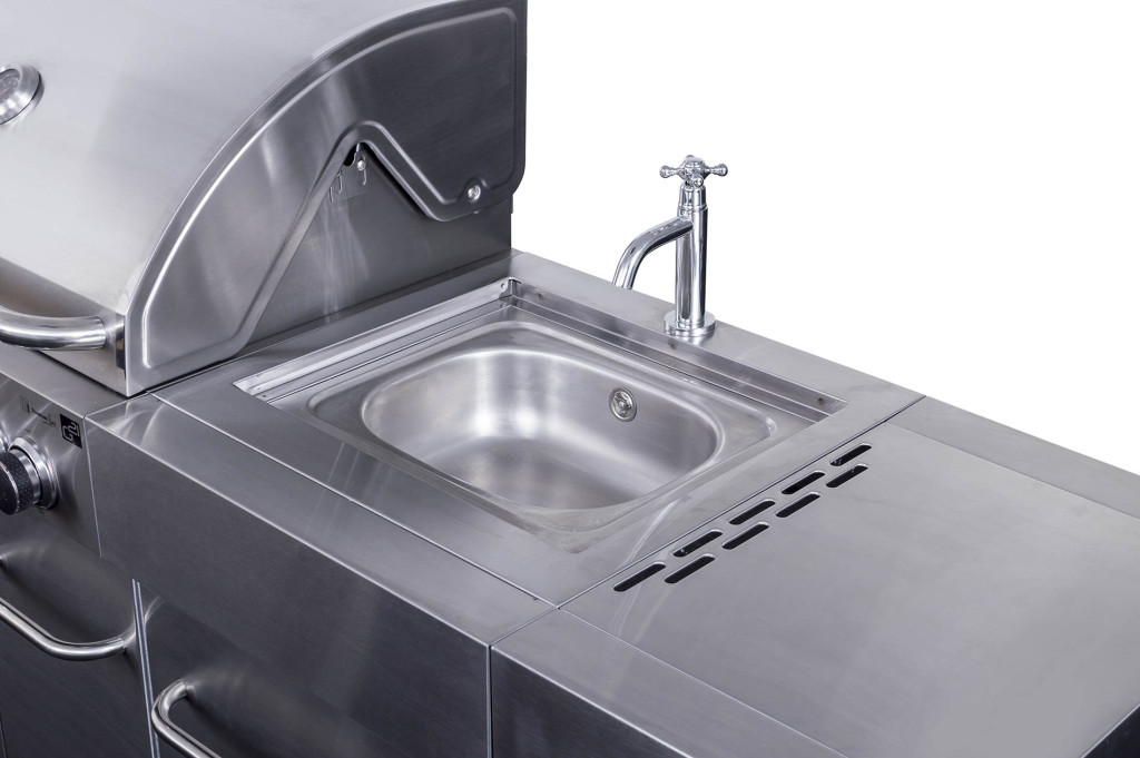 Mi nem hiányozhat egy konyhából sem? A mosogató. És az nem hiányzik a G21 BBQ Arizona Premium Line grillnél sem. A beépített mosogató egy vízcsővel vanellátva, mely a kerti tömlőre csatlakoztatható. Az edények elöblítéseután a mosogatót egy fa vágódeszkával takarhatja le, így nagyobbmunkafelületet kap a finomságok elkészítésére a nyári grillezéshez.