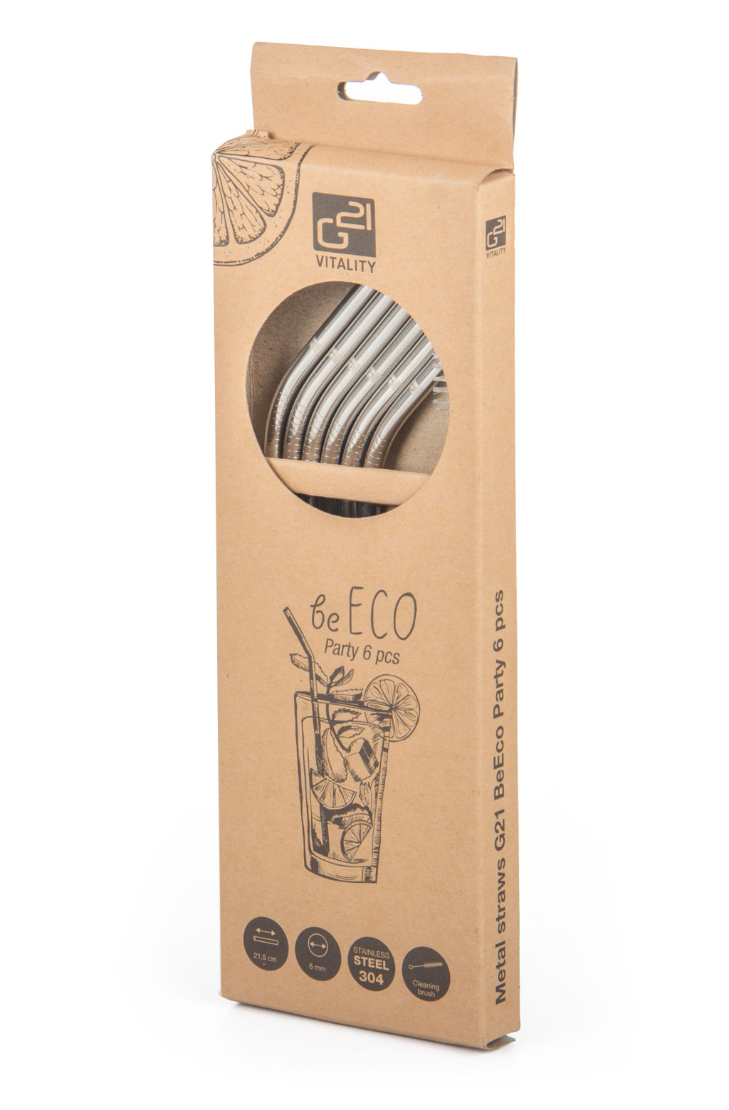 Vásároljon elegáns, tartós, stílusos és mindenekelőtt ökológiai rozsdamentesacélból készült szívószálatkat. A készlet tartalmaz 6 egyenes rozsdamentes acél G21 BeEco Party szívószálat, 6 mm átmérővel és 21,5 cm hosszúsággal, valamint egy tisztító kefét. Ívelt szívószálakat is kínálunk, melyeket itt találhat meg.