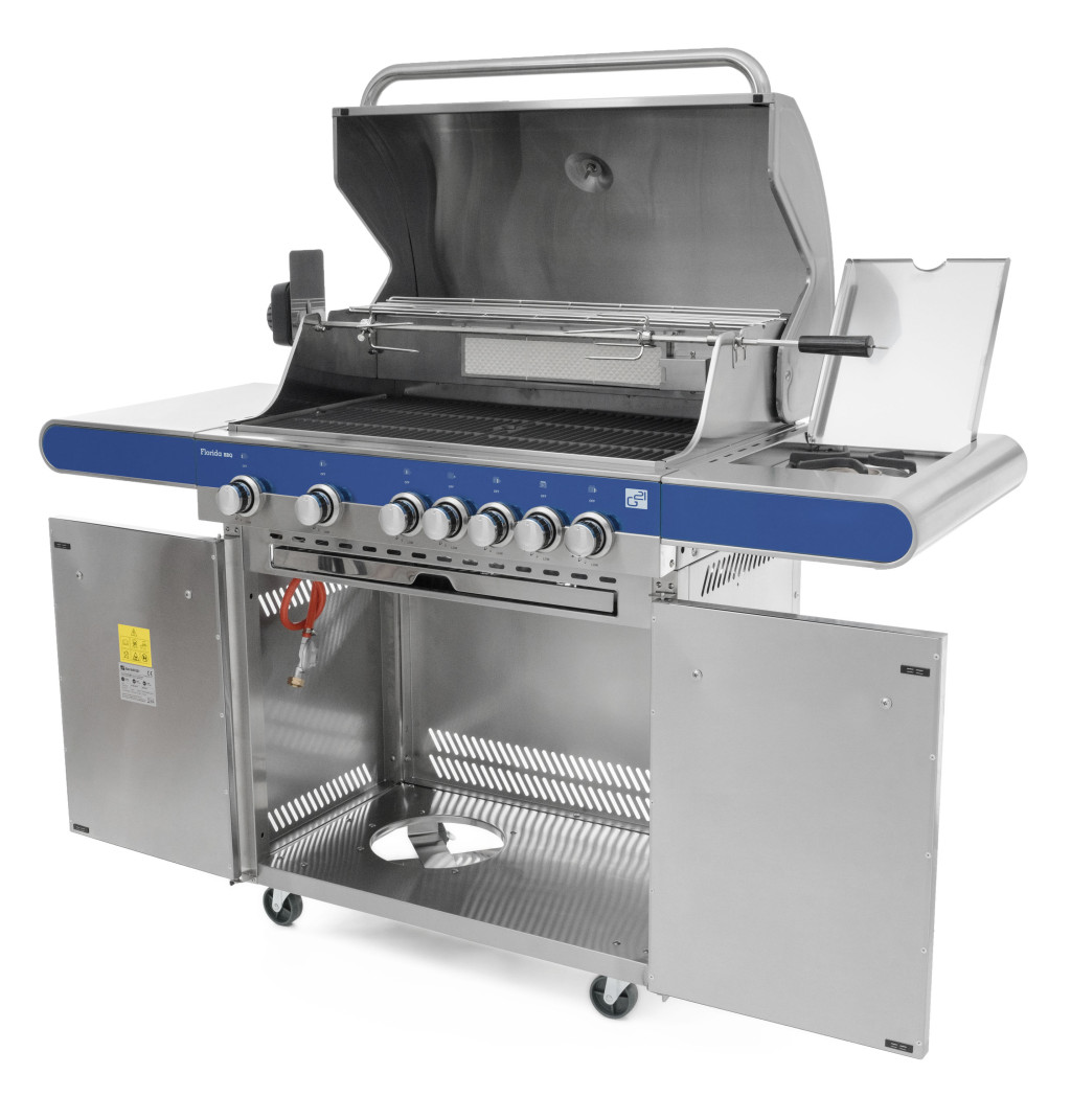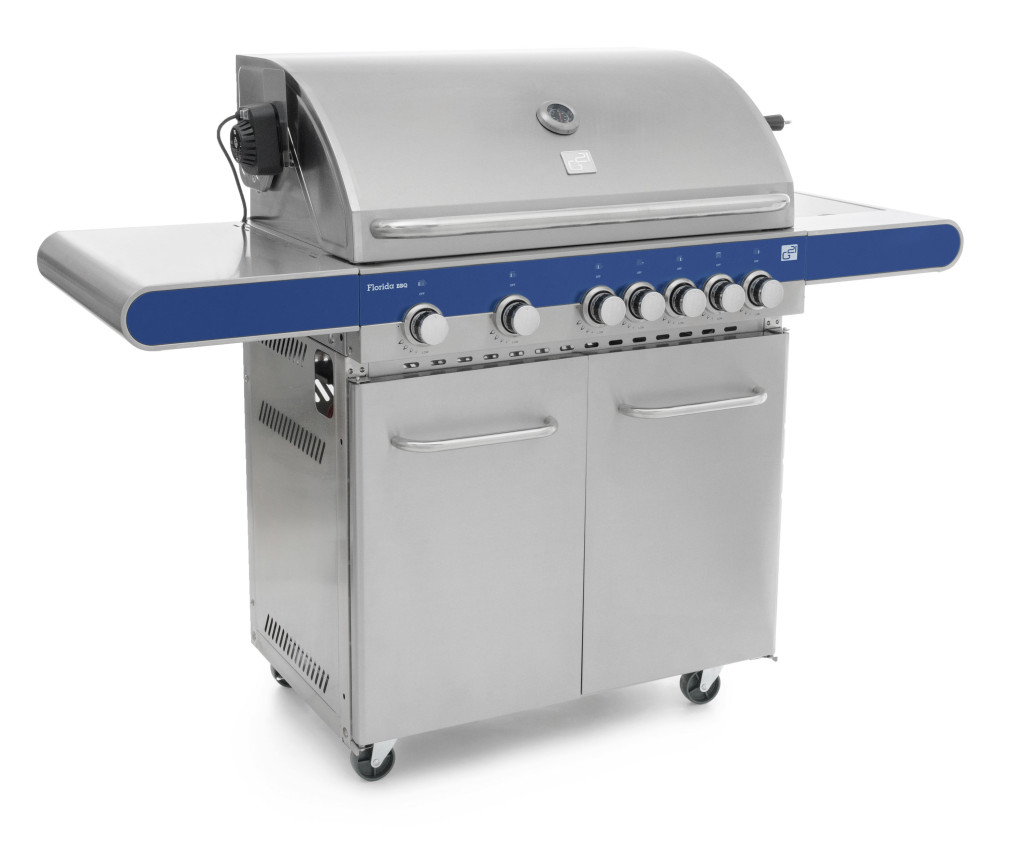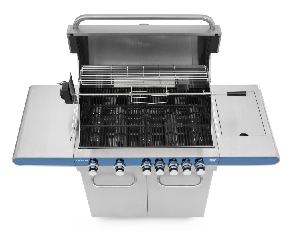 A Florida BBQ kerti gázgrilltökéletes egyvelege a funkcionalitásnak, a technológiának és alenyűgöző formatervezésnek. A rozsdamentes acélból készült grill 7 égővel(7 x 4 kW), praktikusan kialakított polcokkal és a fedélben lévőbeépített hőmérőjével kiemelkedő figyelmet érdemel.