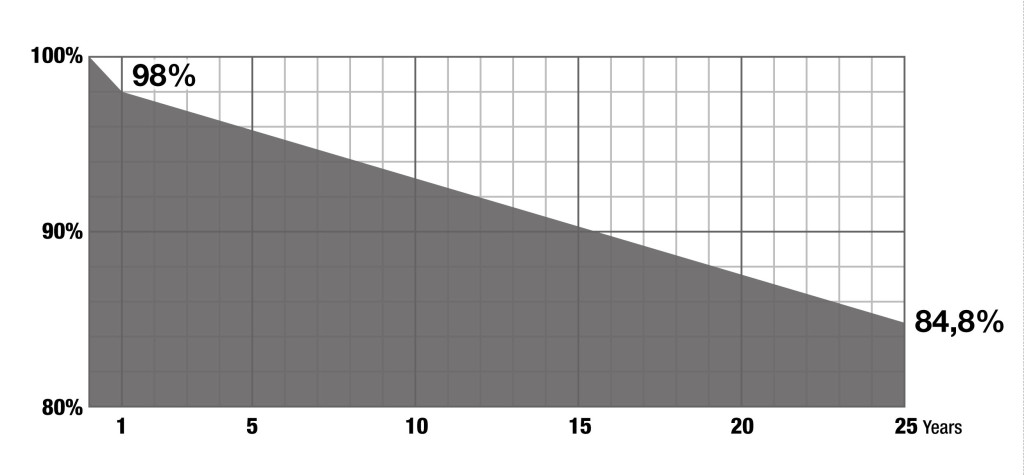 • garancia a napelem 84,8 % teljesítményére 25 évig