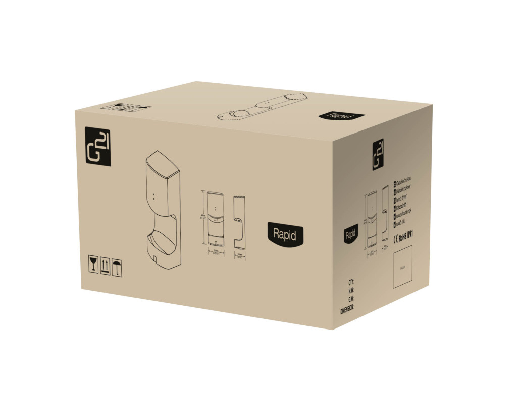 Nincs többé vizes padló! A kézszárítók többségénél a víz a padlón végzi, viszont a G21 Rapdi készüléknél ez nincs így! A kézszárító a vizet az alján található tartályban gyűjti össze. A G21 Rapid-ot leginkább iskolákba, kórházakba, nyilvános épületekbe, éttermekbe, és irodákba ajánljuk.