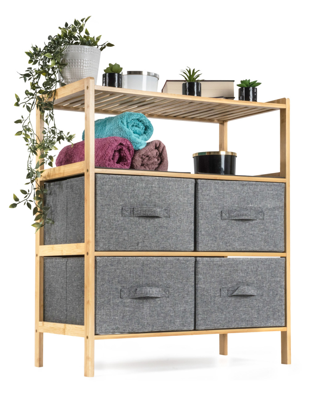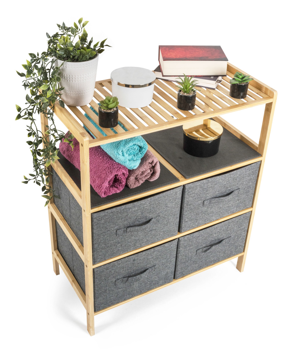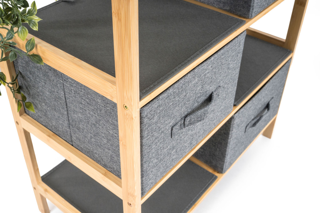 A bambusz meglepően könnyű, így könnyedén kezelheti az egész állványt kosarakkal. Ugyanakkor elég erős ahhoz, hogy elviselje a nagyobb terhelést. Emellett a bambuszfa egyik kiváló tulajdonsága a nagy nedvességállóság a és természetes rezisztenciája a baktériumokkal és gombákkal szemben, így nem kell aggódnia az elhelyezés miatt. a fürdőszobában vagy a mosókonyhában.