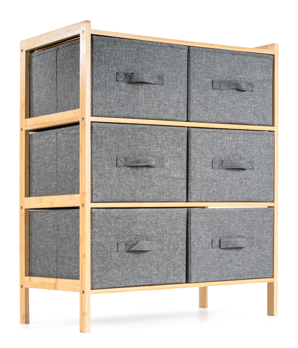 A praktikus állvány 6 kihúzható textilkosárral sok helyet takarít meg, és mindent tárolhat benne, amire szüksége van. Mosodai vagy kozmetikai cikkek, ruhák és gyermekjátékok. Mindegyik kosár térfogata 20 liter, szélessége 31 cm, magassága 19 cm és mélysége 35 cm. Az egész állvány mindössze 78,5 cm magas.