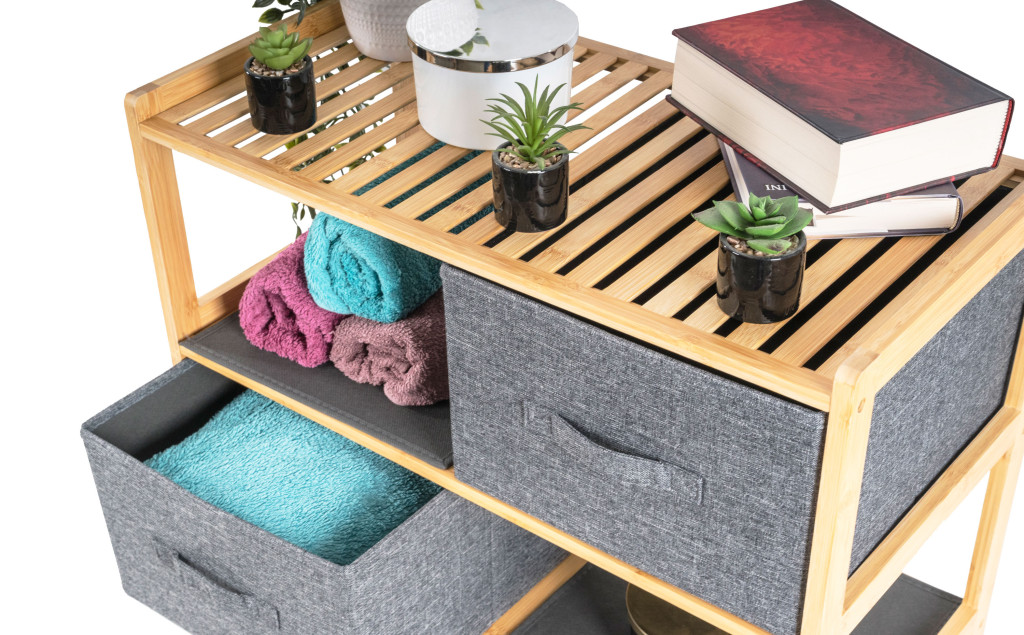 A kihúzható szövetfiókokkal ellátott bambuszpolc kellemes természetes érzetet ad a belső térnek, könnyedség és természetesség érzetet kölcsönöz a belső térnek, miközben szilárdsága és hosszú élettartama stabilitást és tartósságot biztosít. .