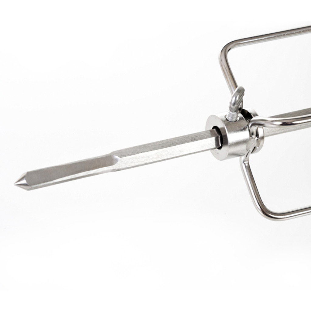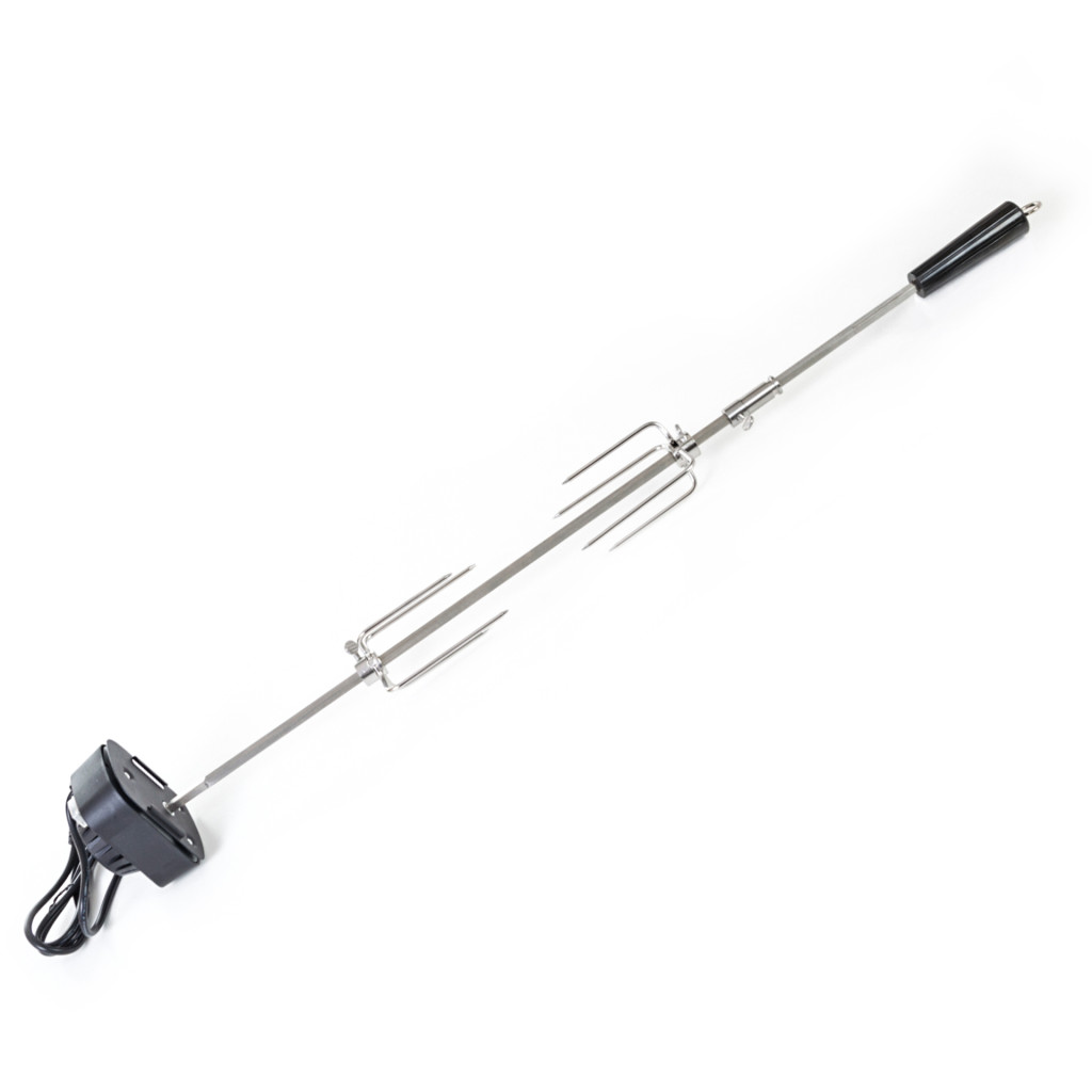 Az egyik oldalon a nyárs levehető műanyag fogantyúval van ellátva, amelyen egy praktikus akasztógyűrű is található. A másik végén egy motor található műanyag házban, amelyen egy be-/kikapcsoló gomb is helyet kapott. A 230 V feszültségű motor egyszerűen csatlakoztatható a hálózathoz a kb. 125 cm hosszú kábel segítségével. A motor körülbelül 2 fordulat/perc sebességgel forgatja a nyársat, így az étel nem ég meg, hanem egyenletesen sül át.