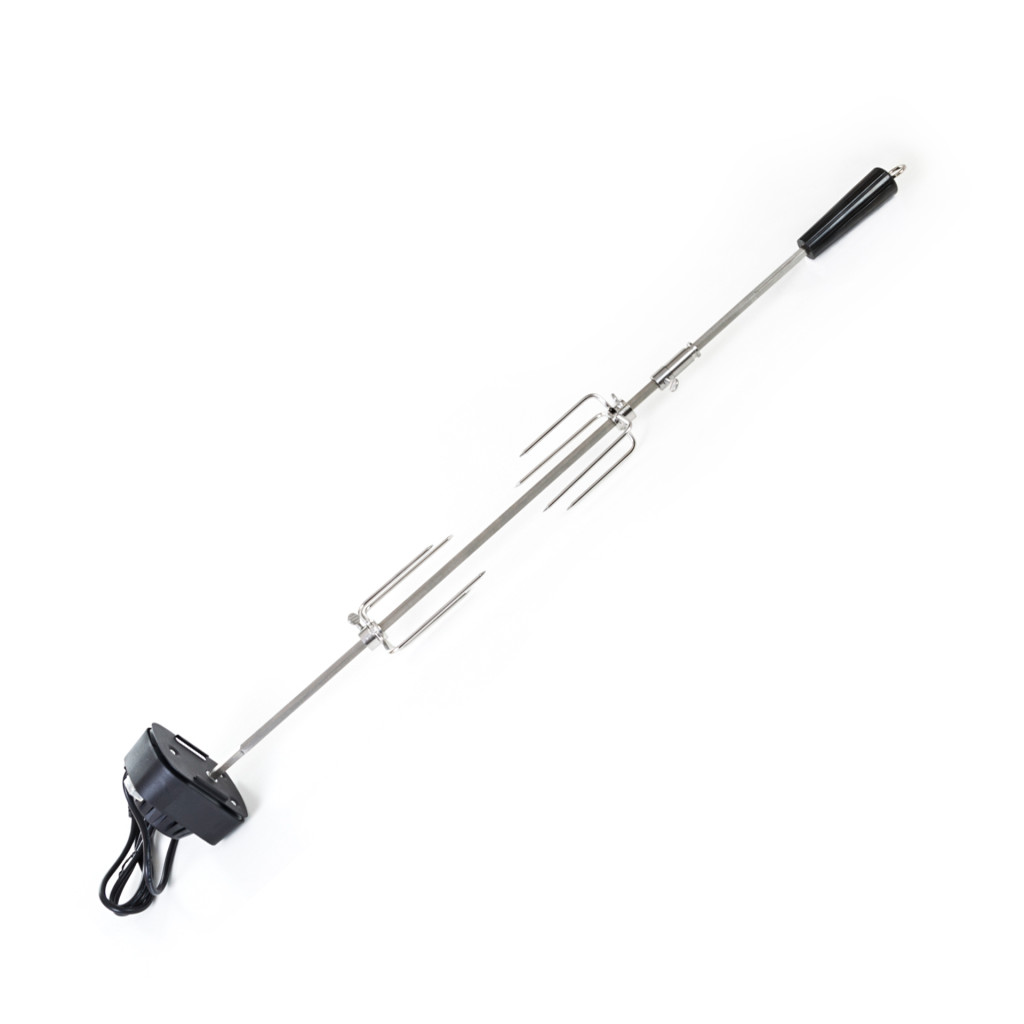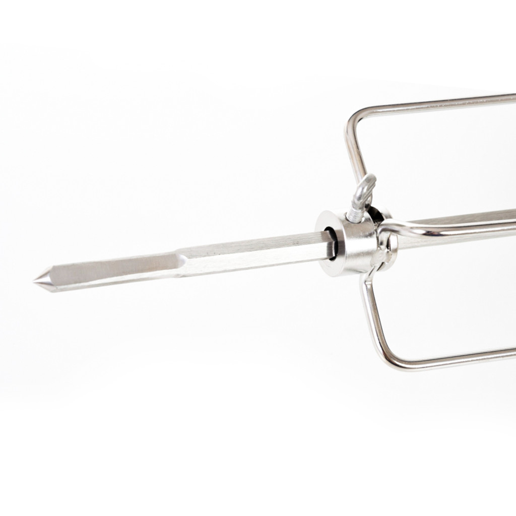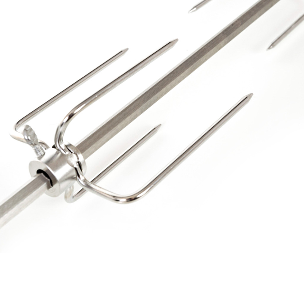 A motoros grillnyárs rozsdamentes acélból készül és mindkét oldalán négy tűvel van ellátva, rögzítő csavarokkal kiegészítve, amelyeknek köszönhetően a tűket saját igényei szerint állíthatja be.