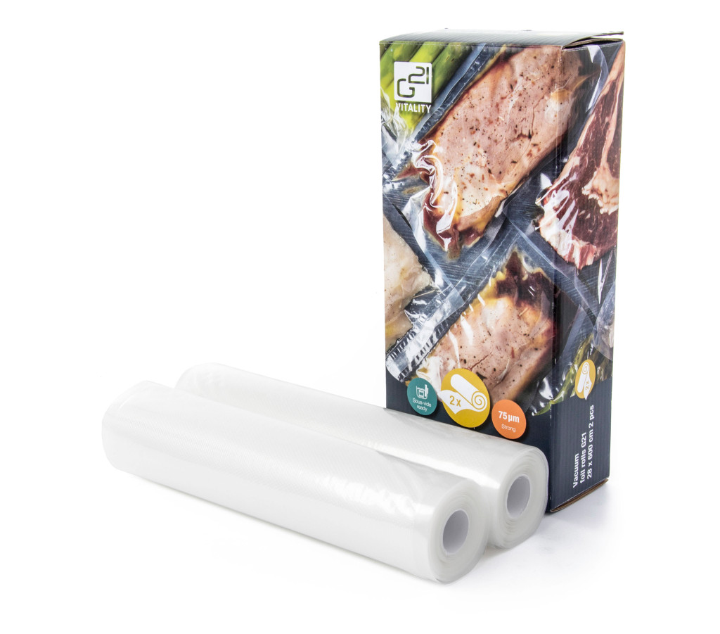 Jó minőségének és nagyszerű kialakításának köszönhetően a 600 x 28 cm méretű G21 vákuumtekercs nemcsak az élelmiszerek eltarthatóságának meghosszabbítására, de a hűtőszekrényben, vagy a fagyasztóban történő tárolására is alkalmas. Felhasználható a sous-vide főzéshez is.