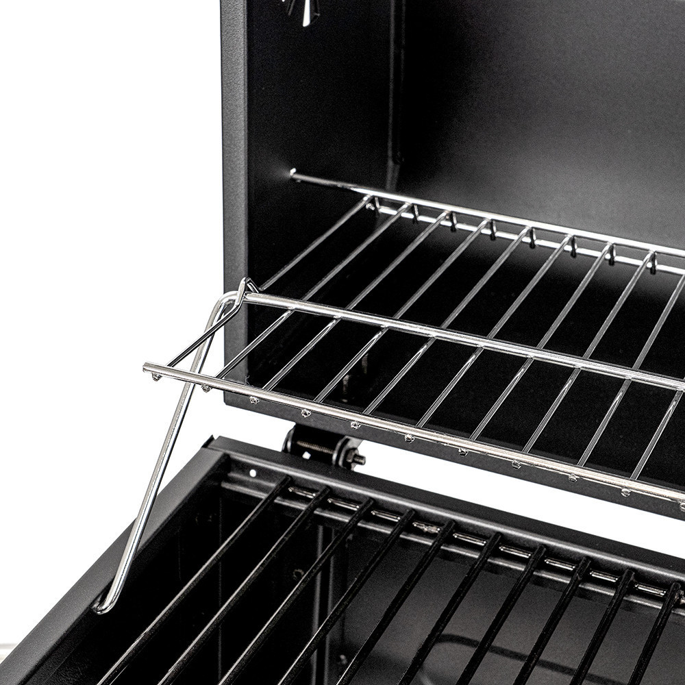 A grillsütő kocsis kivitelű, amely megkönnyíti az elhelyezést és az áthelyezést a kertben vagy a teraszon. Az egyik oldalon kialakított polc előkészítéshez vagy grilleszközök elhelyezéséhez használható. Az alsó tárolópolc további helyet biztosít faszén vagy kiegészítők számára, míg a kerekek segítségével a grillsütő könnyen mozgatható.