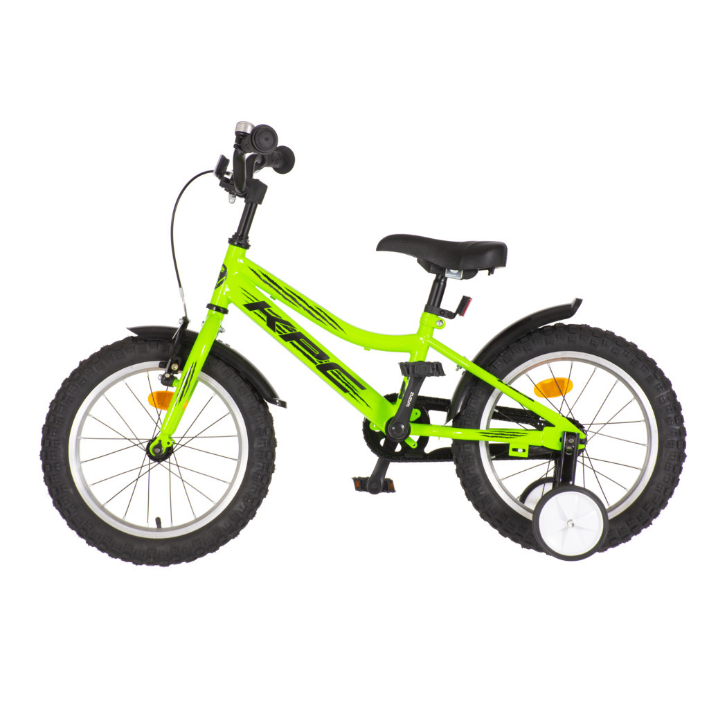 Ez a KPC márkájú dínós, sötétben világítós gyermek kerékpár, ami egy 100% magyar védjegy, ideális választás 4-6 éves fiúk számára. Acél váz és villa biztosítja a tartósságot, miközben a V-fék elől és a kontrafék hátul hatékony fékezést biztosít. Az egysebességes hajtómű egyszerűvé teszi a hajtást, míg a 16 hüvelykes, 16x2,125"-ös gumiköpenyek megfelelő tapadást és kényelmes gördülést garantálnak. Az acél 20 küllős első agy és a kontrás hátsó agy biztosítják a sima mozgást. Az oldalkerekek segítik a gyermek stabilitását a tanulás során. Az ideális belső lábhossz 43-58 cm, súlya pedig mindössze 9,8 kg. Ez a kerékpár igazán különleges kombinációja különböző nemzetközi, minőségi elemeknek. A magyar származású Egrokor fluoreszkáló festék látványossá és biztonságossá teszi a kerékpárt, míg az olasz Selle Monte Grappa nyereg kényelmet biztosít hosszabb utakon is. A német Hebie Chainlooper formabontó és innovatív Meghajtásvédő technológia biztosítja a praktikus és esztétikus megoldásokat. A Vajdaságban történő összeszerelés és a vajdasági gyártású kerekek garantálják a prémium minőséget, miközben a KMC Meghajtás és a Thun monoblokk magas szintű megbízhatóságot nyújt. A CST köpeny pedig biztosítja a kényelmes és sima közlekedést. Az állítható ülés és kormány pedig további kényelmet biztosít és követi a gyermek növekedését. Normál nappali tárolási körülmények között akár 8 órán át világít a sötétben, így gyermeke biztonságban hazatekerhet a játszótérről, oviból ha időközben rásötétedik, nem helyettesíti a kötelező világítás és prizma használatát.