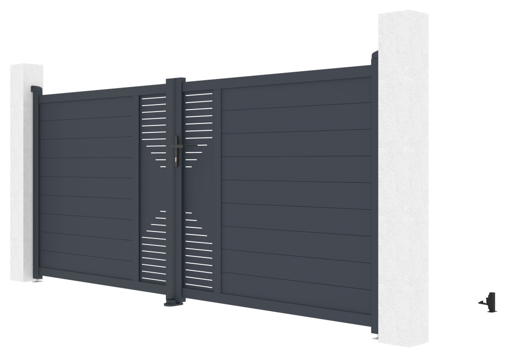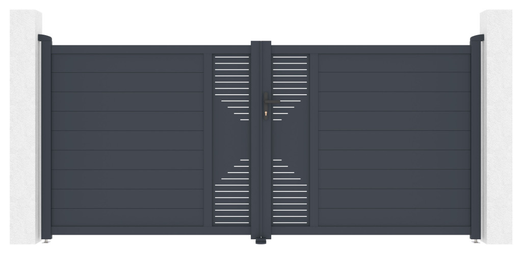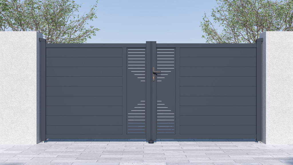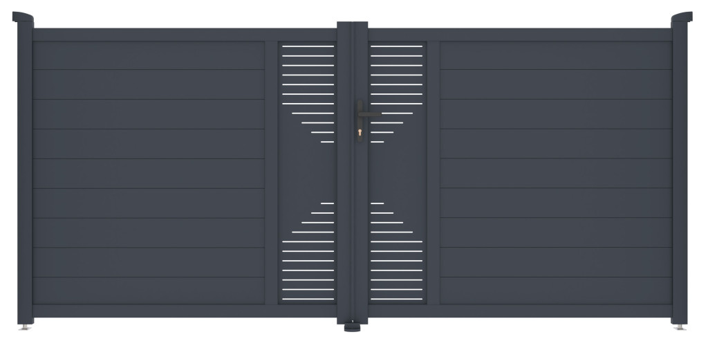 A Marion kétszárnyú bejárati kaput könnyű, mégis nagyon megbízható és mindenekelőtt karbantartást nem igénylő alumíniumból készítettük. Repedésnek és hajlításnak ellenálló, nem rozsdásodik és a nagyobb tartósság érdekében porszórt bevonattal felvitt antracit árnyalat ad tetszetősséget és színtartósságot a bejárati ajtónak. Ezenkívül a Marion alumínium kapu megerősített profilja lehetővé teszi a jövőben elektromos nyílás beépítését.
