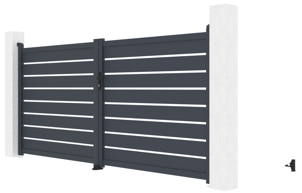 A vízszintesen elhelyezett lécekkel ellátott, tetszetős grafit kialakítású kitöltés a kellő magánéletet ötvözi a modern dizájnnal, így a kapu bármilyen típusú bekerített szerkezethez illeszkedik.