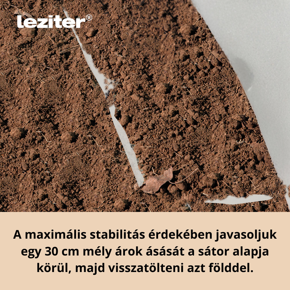 • Rögzítés: a fólia körbefutó „szoknyarésszel” leterhelhető vagy földbe ásható