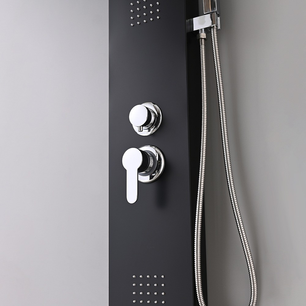 A zuhanypanelhez tartozik egy kézi zuhany is, amely lehetővé teszi a célzott vízsugarak irányítását és a test bármely részének alapos tisztítását. A rozsdamentes flexibilis zuhanygégecső hossza 1,5 m, amely elegendő mozgásszabadságot biztosít a zuhanyozás során. Ez a tartós és kényelmes zuhanykiegészítő megkönnyíti a fürdést és a tisztálkodást. A Malaga Black hidromasszázs zuhanypanel sárgaréz betétes váltószeleppel és krómozott karral rendelkezik, amely lehetővé teszi a különböző víznyomás és hőmérséklet beállítását.