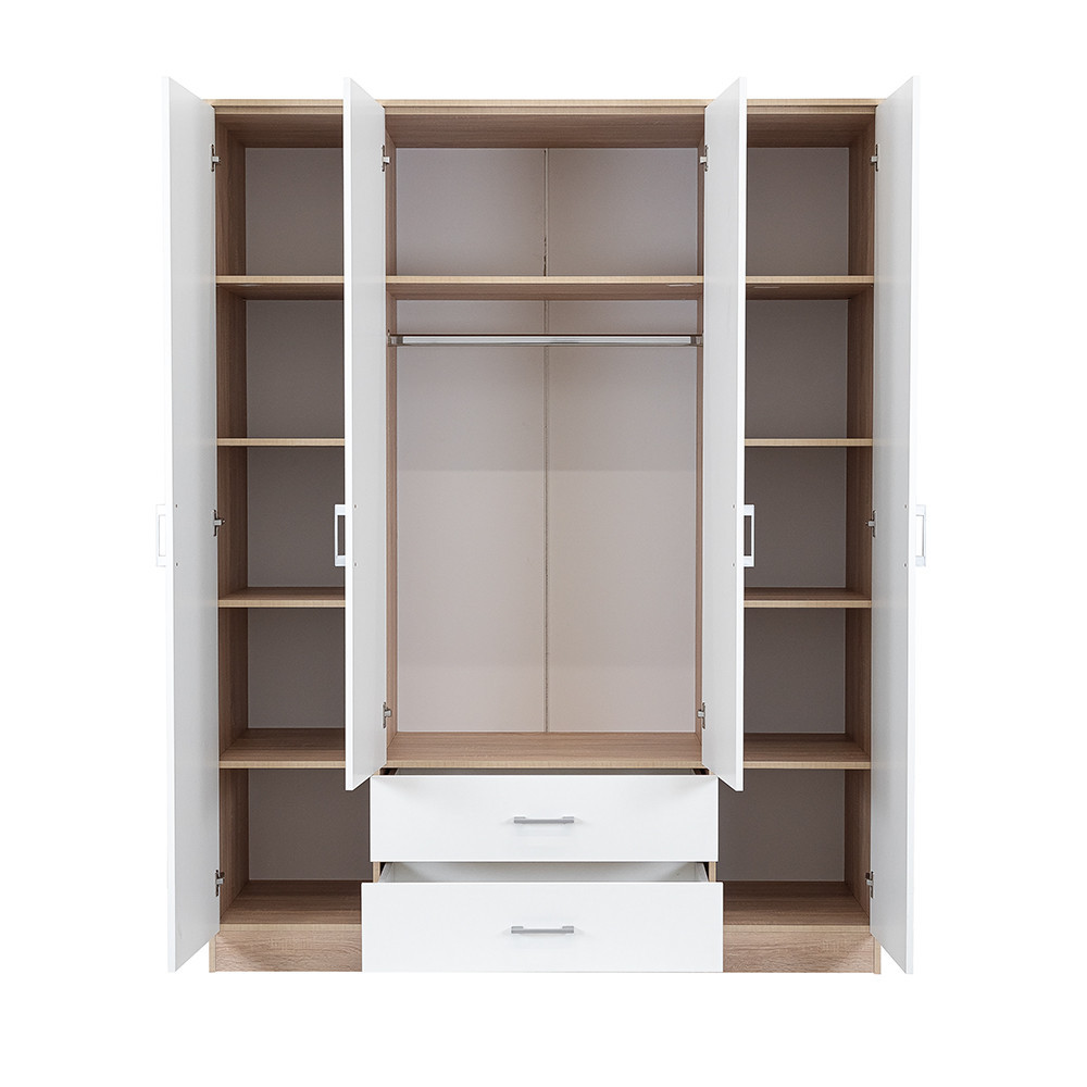 Az elegáns fehér front és a fahatású sonoma tölgy korpusz ötvözete tökéletes harmóniát teremt a nappaliba vagy a hálószobába egyaránt. A 205 cm magas, 160 cm széles és 55 cm mély gardróbszekrény ideális választás mindenki számára, aki szeretné rendszerezni ruháit és kiegészítőit.