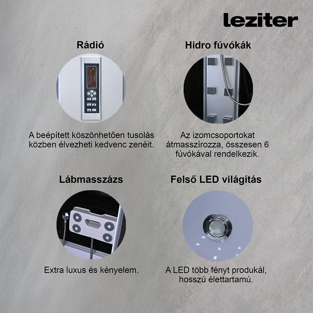 A beépített rádiónak köszönhetően zuhanyzás közben is hallgathatók kedvenc zenék vagy rádióműsorok. A felső LED világítás kellemes, hangulatos fényt biztosít a zuhanykabin belsejében, amely tovább erősíti a wellness élményt.