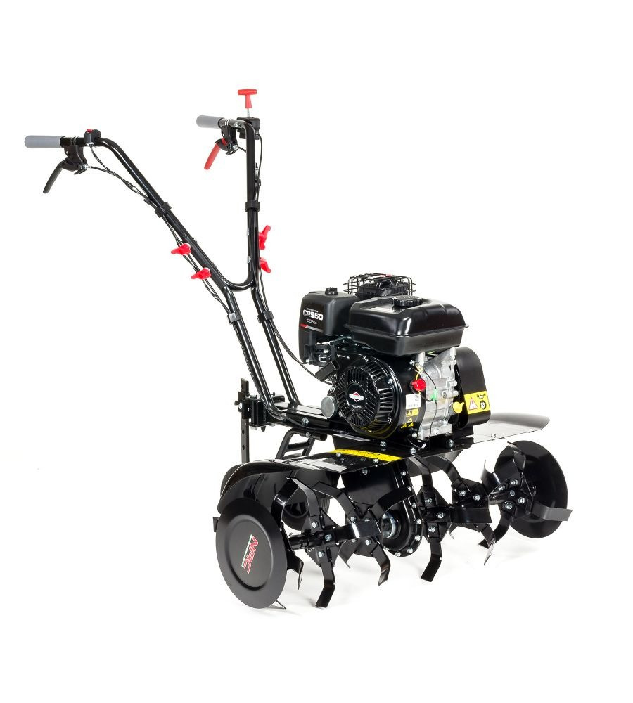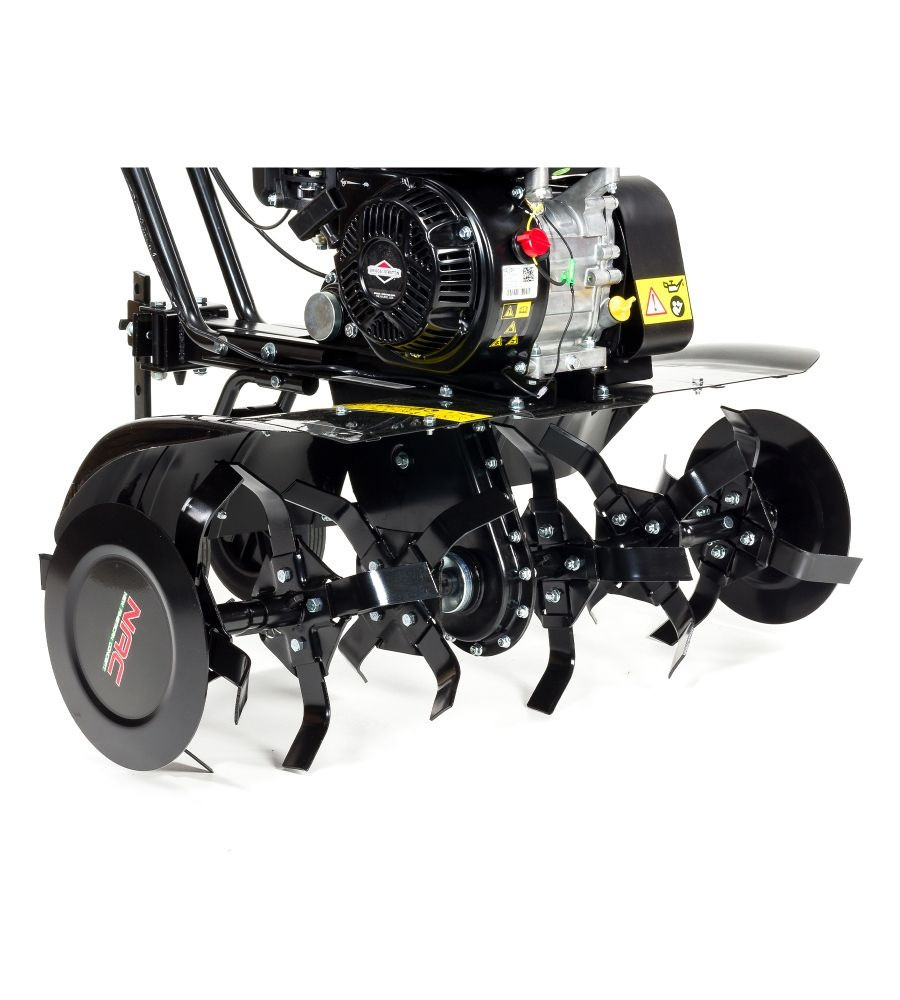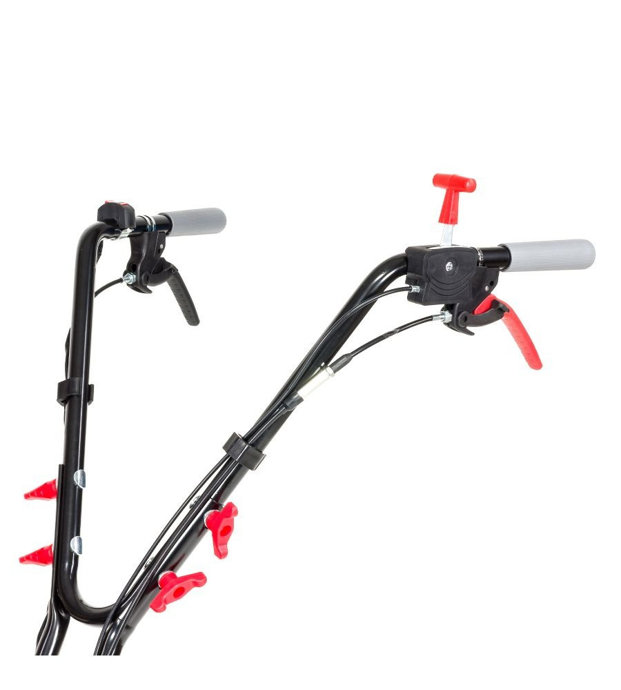 A kényelmes munkavégzést a ergonomikus fogantyúk biztosítják, amelyek természetes helyzetben tartják a kezeidet. A szükséges stabilitást a két nagyméretű hátsó támasztókerék biztosítja. Ezek lehetővé teszik a kultivátor könnyű mozgatását és a problémamentes szállítást. Egy fontos biztonsági funkció a késhajtás aktiválás elleni védelem, amelyet véletlen személyek nem tudnak működésbe hozni a motor működése közben.