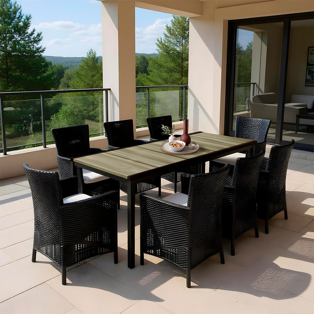 A Nadia Large garnitúrában minden benne van, ami egy gondtalan kültéri étkezéshez, nyári estéhez vagy baráti összejövetelhez kell. A hat darab kényelmes, kartámaszos Iowa fotelhez egy tágas, 200 × 95 cm-es Porto étkezőasztal tartozik – mindez időjárásálló, UV-védett, stílusos kivitelben.