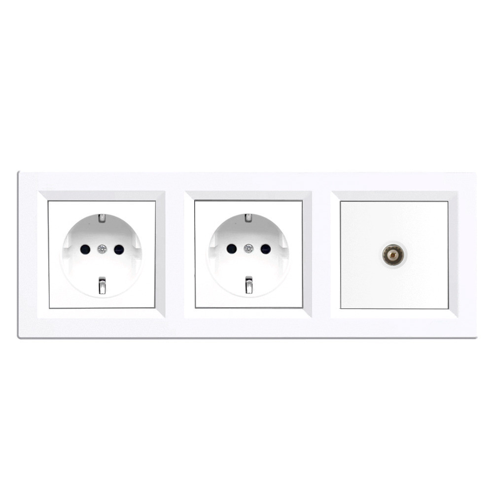 A Nova III kettő földelt csatlakozóaljzat TV csatlakozóval egy praktikus, helytakarékos megoldás, amely egyetlen szerelvényben biztosítja két elektromos készülék biztonságos áramellátását és egy televízió vagy beltéri egység stabil jelcsatlakoztatását. A földelt aljzatok 16 A névleges áramerősséggel és 250 V AC feszültséggel működnek, alkalmasak háztartási és irodai eszközök, valamint nagyobb teljesítményű fogyasztók, például konyhai gépek, számítástechnikai berendezések számára. A koaxiális RF TV aljzat megbízható, zavarmentes jelátvitelt biztosít, ezáltal kiváló kép- és hangminőséget nyújt.
