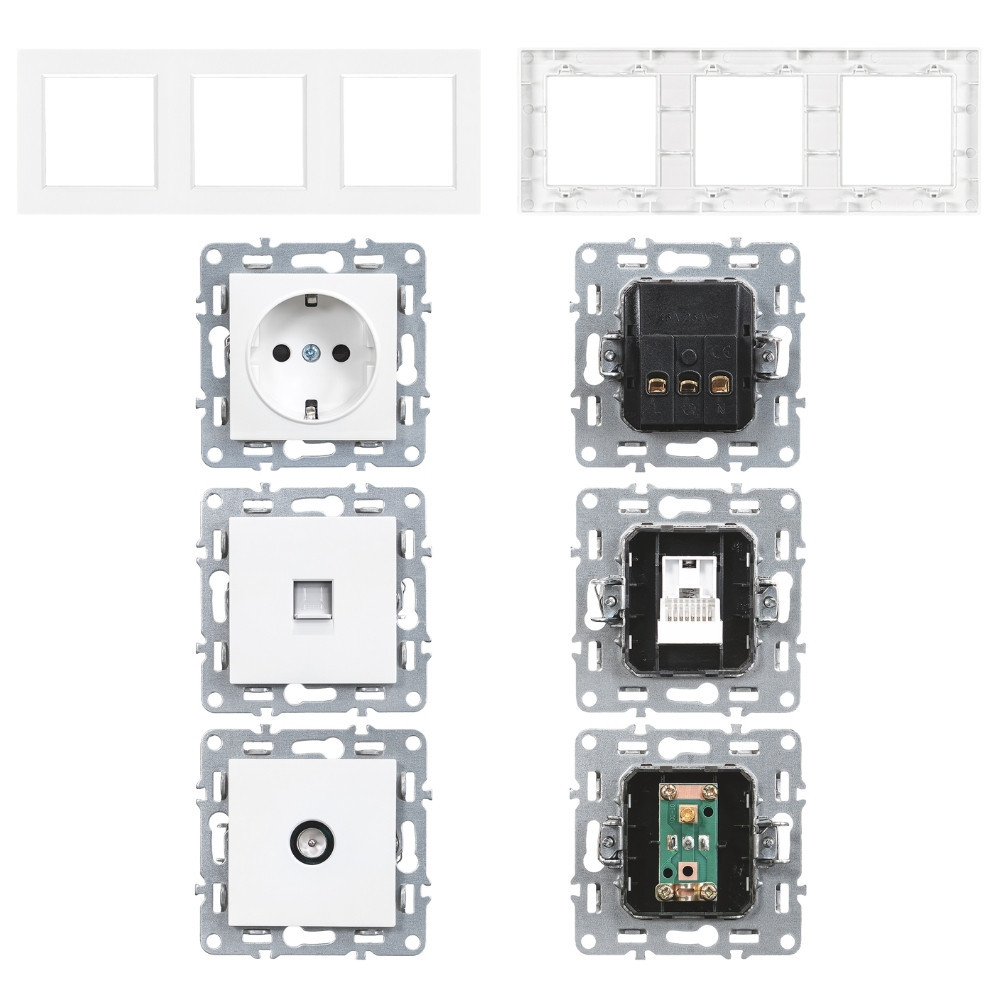 Ez a Nova szerelvényszett ideális megoldás azoknak, akiknek fontos a funkcionalitás, az esztétikum és az egységes megjelenés. A hármas kialakítás egy földelt 230 V-os csatlakozóaljzatot, egy RJ-45-ös UTP aljzatot és egy koaxiális TV csatlakozót foglal magába – mindezt egyetlen, letisztult fehér keretbe rendezve. A vízszintes modulelrendezés praktikus és jól átlátható.