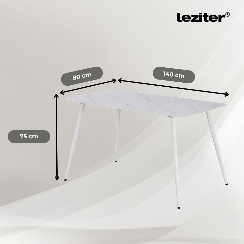 A szett központi eleme a Bora szinterezett kő étkezőasztal, amely 140x80 cm-es méretével kényelmes helyet biztosít 4–6 fő számára. Az asztallap modern technológiával készült, természetes anyagokból – agyagból és homokból – nagy nyomáson, extrém hőfokon égetve. Az eredmény egy hosszú élettartamú, karcálló, foltálló és hőálló asztallap, amely a mindennapos használat során is megőrzi szépségét. A fehérre festett fém lábak masszív stabilitást adnak, miközben letisztult, modern stílust sugároznak.