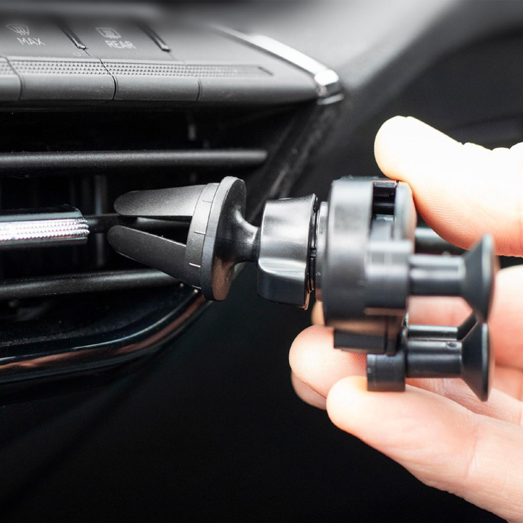 Az egyszerű, egykezes használatnak köszönhetően, a telefon könnyedén helyezhető bele és vehető ki a tartóból, így a figyelme a vezetésen maradhat. A tartó kompakt méretei, 115 x 40 mm, üres állapotban is kevés helyet foglalnak, és a különböző vastagságú lamellákhoz való rögzítési lehetősége növeli a használati flexibilitást.