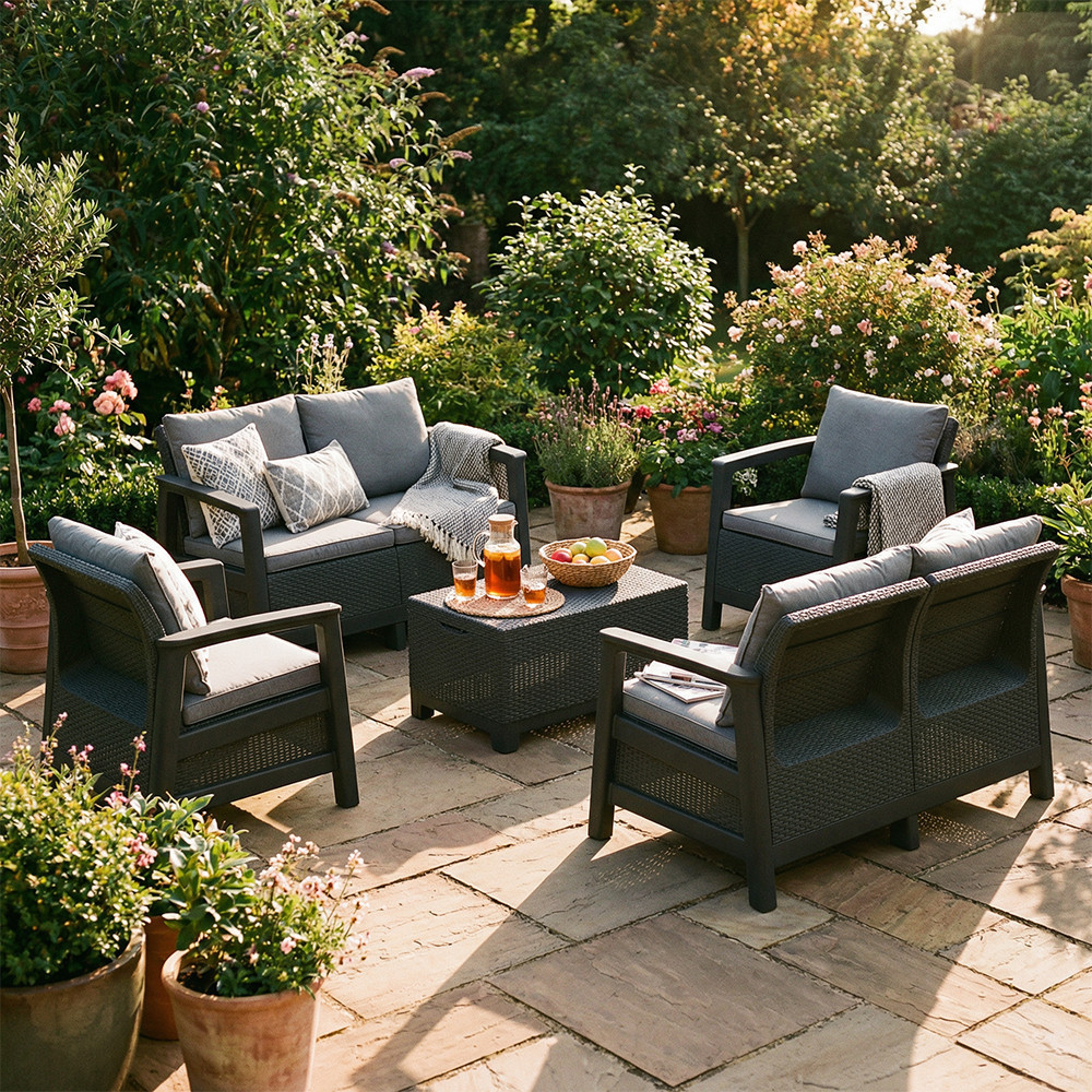 A szett kényelmes beszélgetősarkot alakít ki a kertben vagy a teraszon. Egységes, modern kültéri nappali hozható létre vele, miközben a tárolós asztal praktikus helyet biztosít a kiegészítőknek. Időjárásálló, gondozásmentes megoldás, amely rendezetten és átgondoltan formálja a kültéri teret.