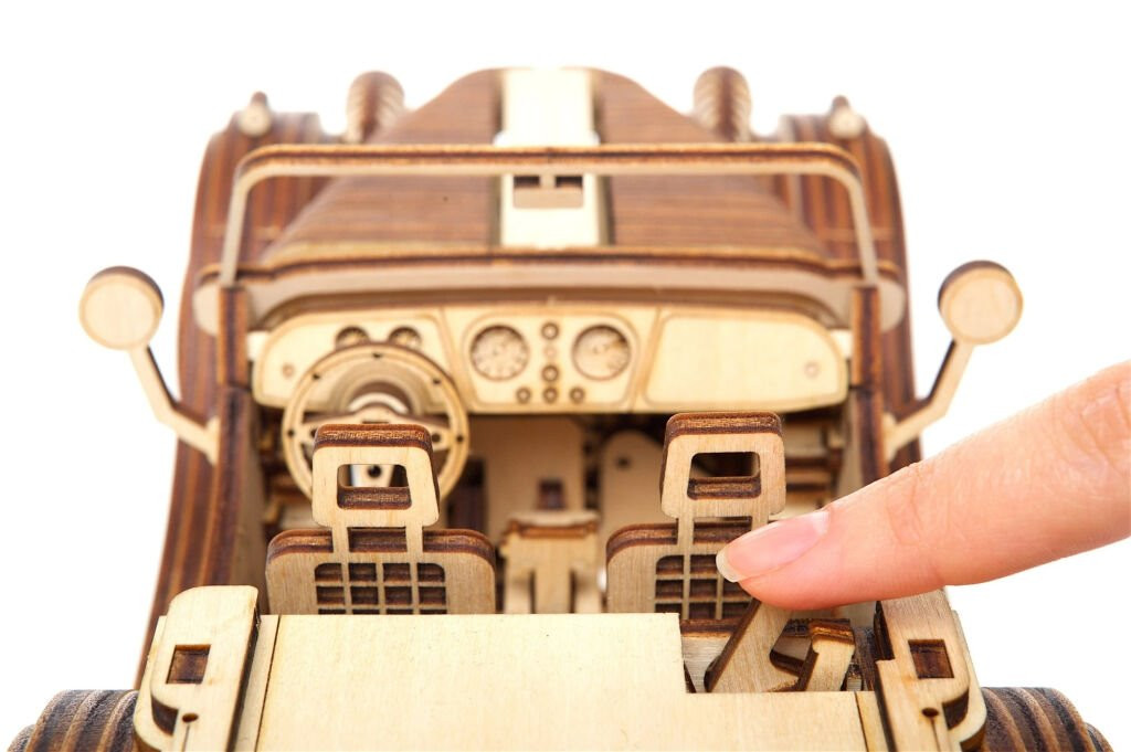 A gyorsaság és a régi idők imádóinak - roadster típusú veterán autó kirakós, rétegelt lemezből. A modell kinyitható ajtókkal és felhajtható motorháztetővel rendelkezik. A mechanika a részletekig át van dolgozva, így Ön megfigyelheti a motordugattyúk mozgását. A jármű irányítható és a felhúzható mechanizmusnak köszönhetően képes mozogni, egy felhúzásra 4 métert tesz meg.Működő sebesség váltóval rendelkezik az üresjáratra és a hátramenetre. Szervezzen versenyt a többi UGEARS modellel!Részletes összeállítási útmutatóval rendelkezik.