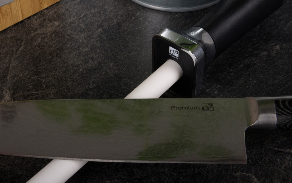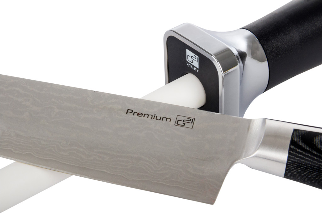 - Helyezze a kést úgy, hogy a penge megfelelő szögben feküdjön a kés élezőn (klasszikus kések 25–30 °, damaszt kések 20–25 °).