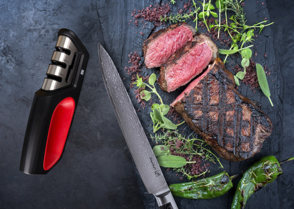 A kés élező kerámiából készült. Fontos információ: a penge élezésekor a kést húzuk, nem pedig toljuk.
